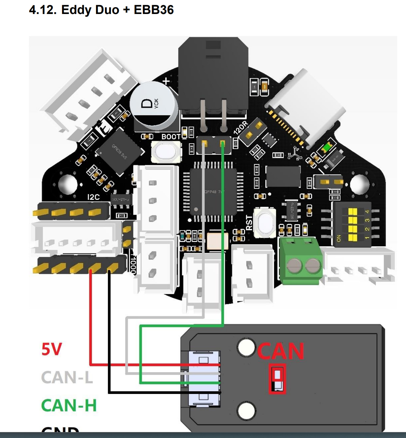 - btt eddy design mount, flash klipper (via usb), plug in to ebb36. I already have the wiring harness made that breaks out the CAN wires from the power wires