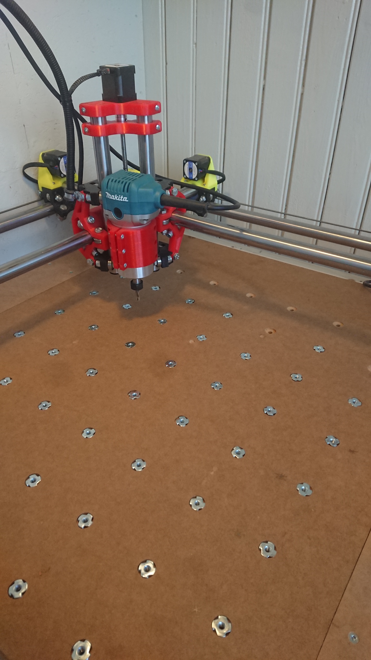 First real CNC project! Drilling out holes for clamps on the wasteboard and hammering down M6 nut inserts. The wasteboard is of course upside down in this picture.