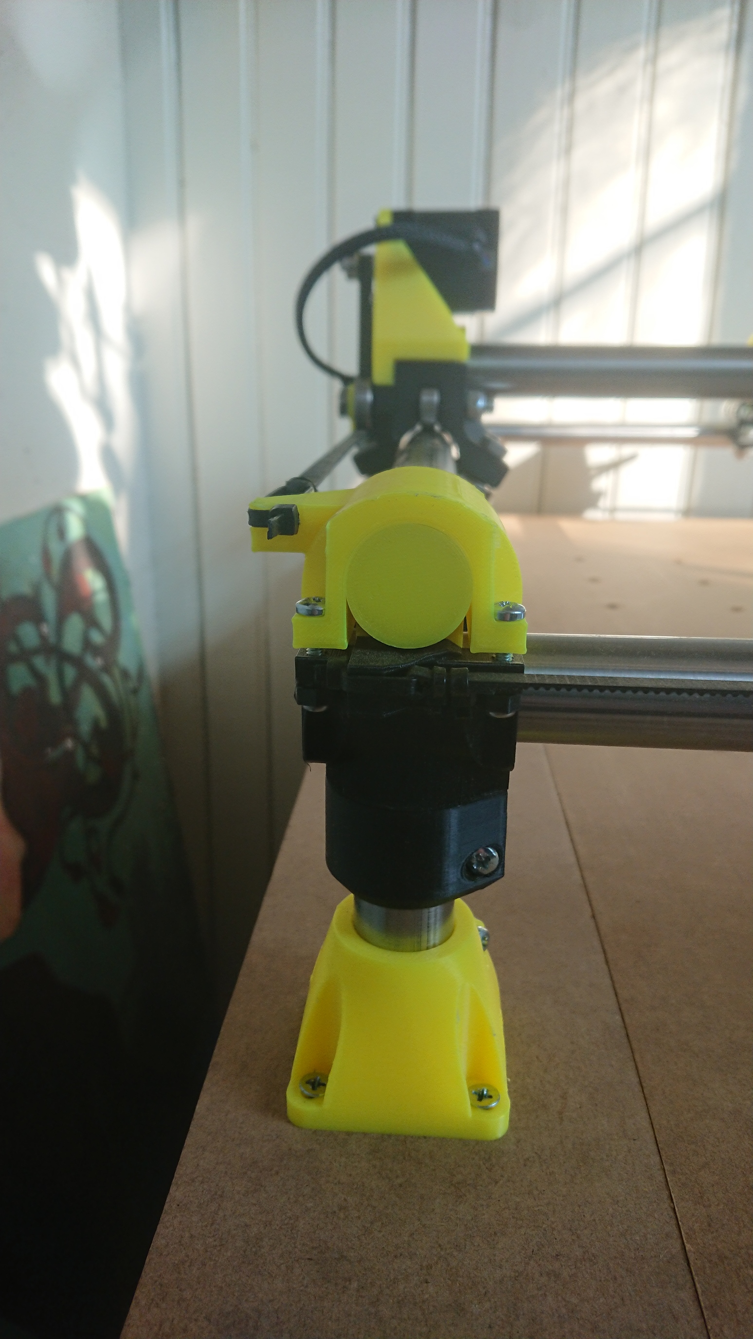 I have not done much in the area of cable management, but I wanted to at least have the gantry neat and tidy from the start. The loop is made out of a piece of drain cleaner coil (the flat metal type) inside a regular flexible cable tube. The metal is springy and bends only one direction and it holds both the router cable and the stepper cable. Cable chains are nicer, I agree, but this was a fast enough solution.