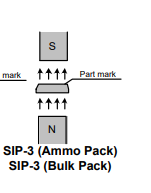Here’s an image from the datasheet. You can picture poking the 3 prongs into the ground and looking down at the part. The taper points to where the sensor is. So you want the taper pointing to the south side of your magnet.