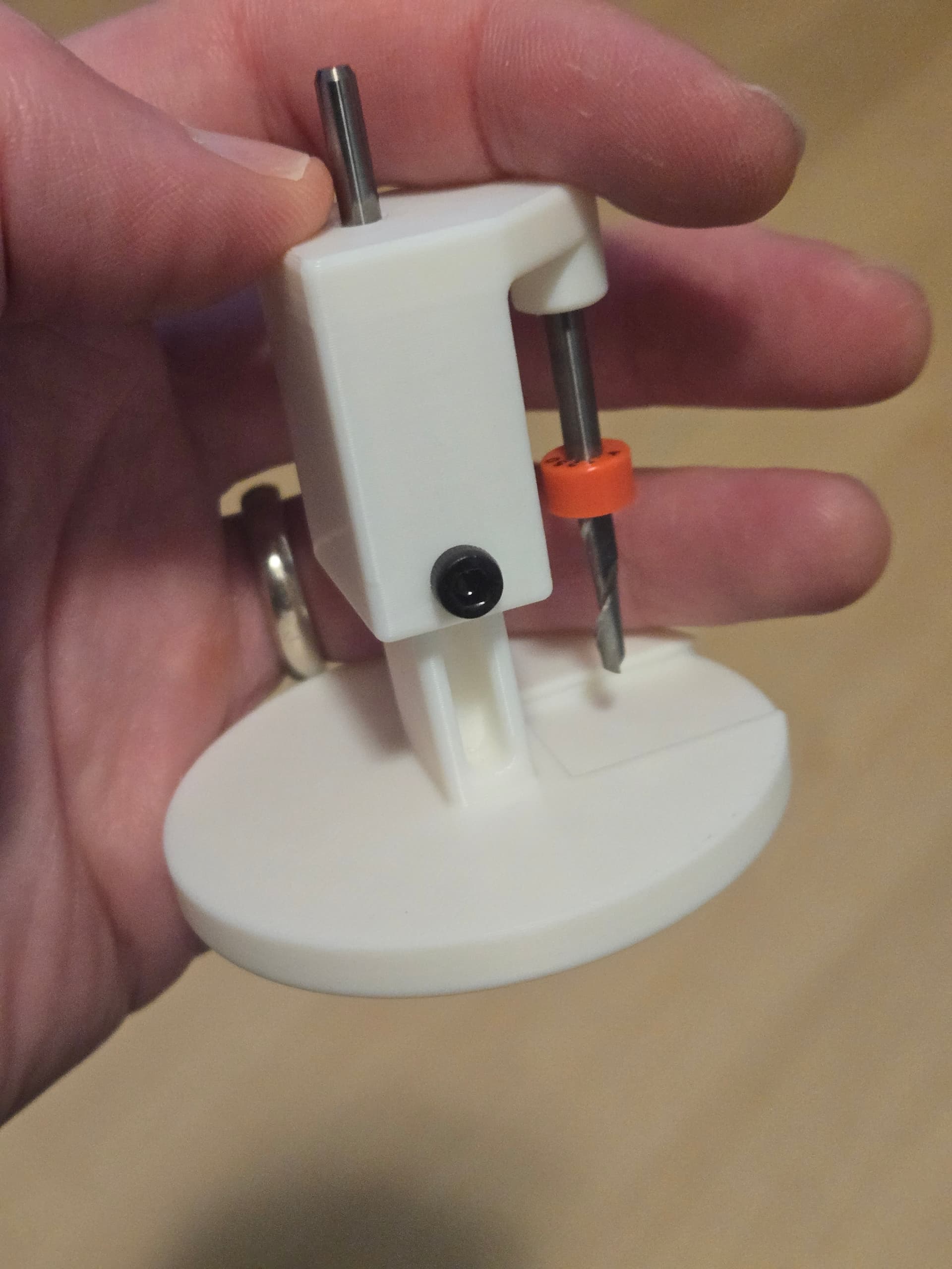 One endmill goes in the top to connect to the collet. Another goes in the spot off to the side. The tiny touchplate slides into the base. The spring connects the 2 3D printed parts.