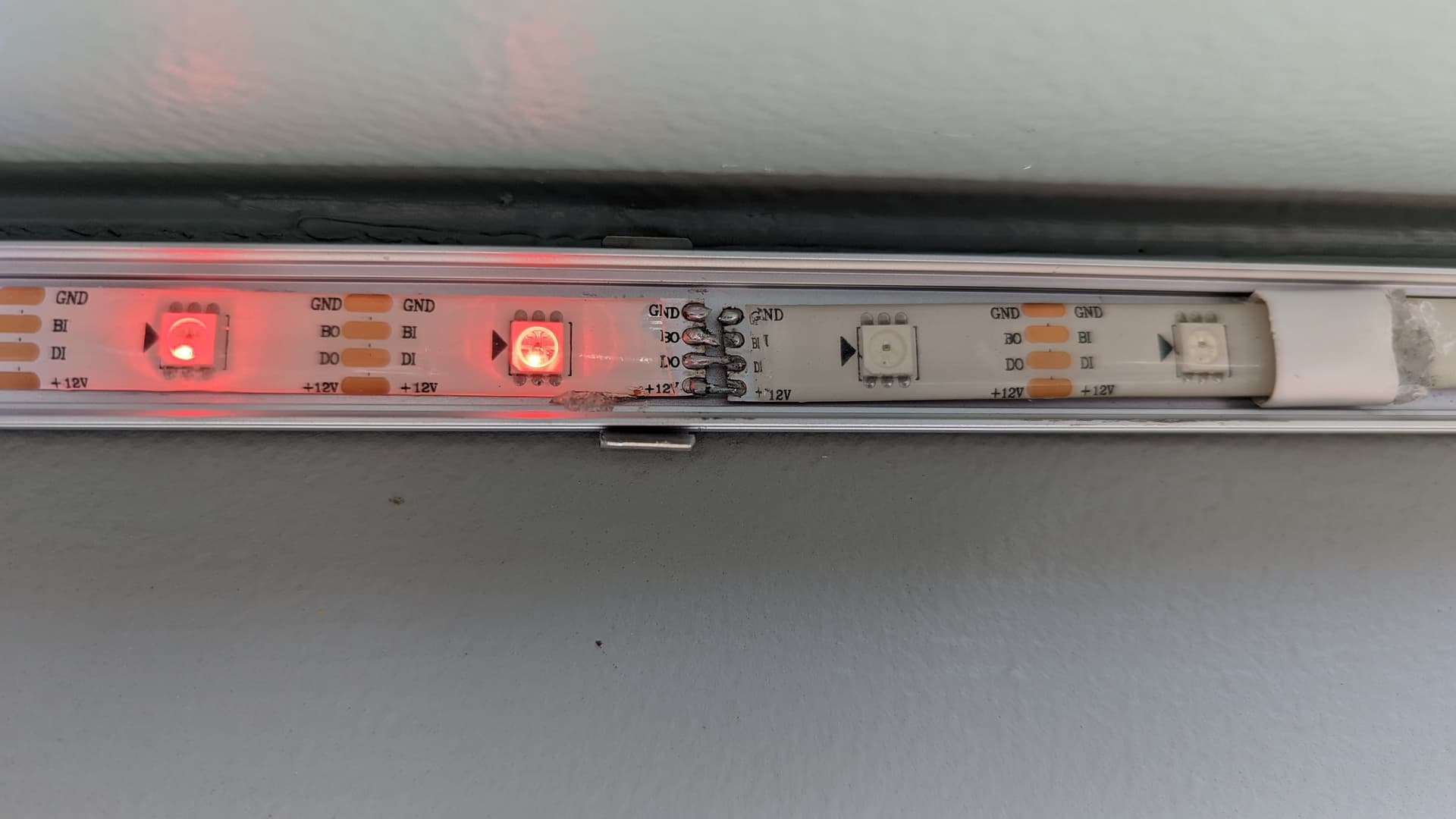 I used some white heat shrink and hot glue to keep it insulated once I had it resoldered. You can see another joint a few leds to the right. This was part of a patch I made during the original install because there was something wrong.
