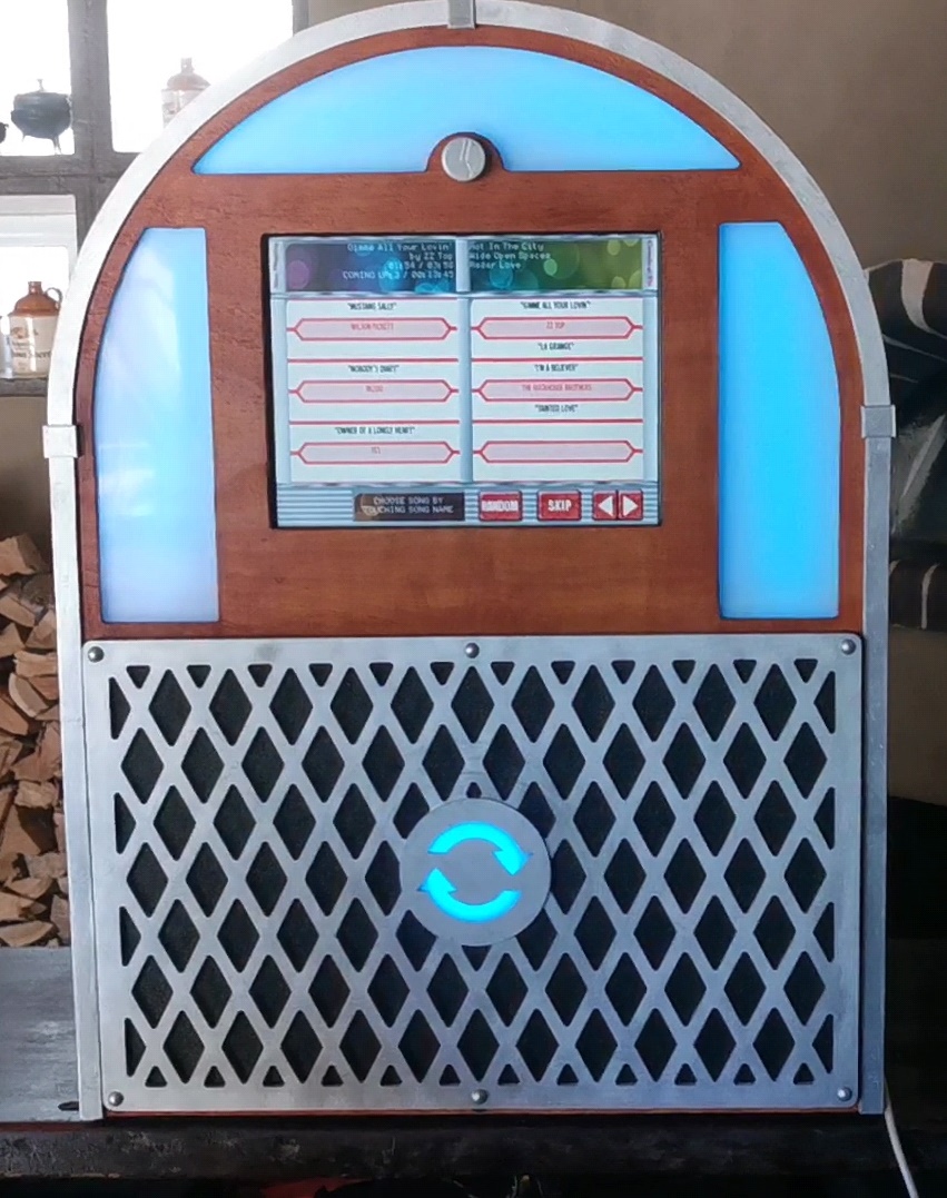 Set the gain in the raspberry software (in my case the exceptionally good “Fruitbox” highly recommended program.) Also, having the inline volume control which is mounted over the touch screen, you can control maximum volume of the amp which is carefully locked inside the cabinet. Stops drunken party revelers trying to blow your speakers. My wife in particular seems to have the uncontrollable urge to max out the volume after a few shooters when ever smokie comes on, “Alice, who the #$*k is Alice” shouted at the top of her voice.