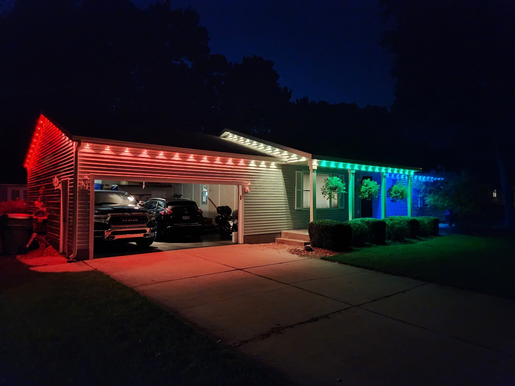 The new LEDs are on the house and the old ones are pulled off. No power injection right now except the halfway point. The two wled controllers are set up as DDP so the first controller runs both halves of the house.