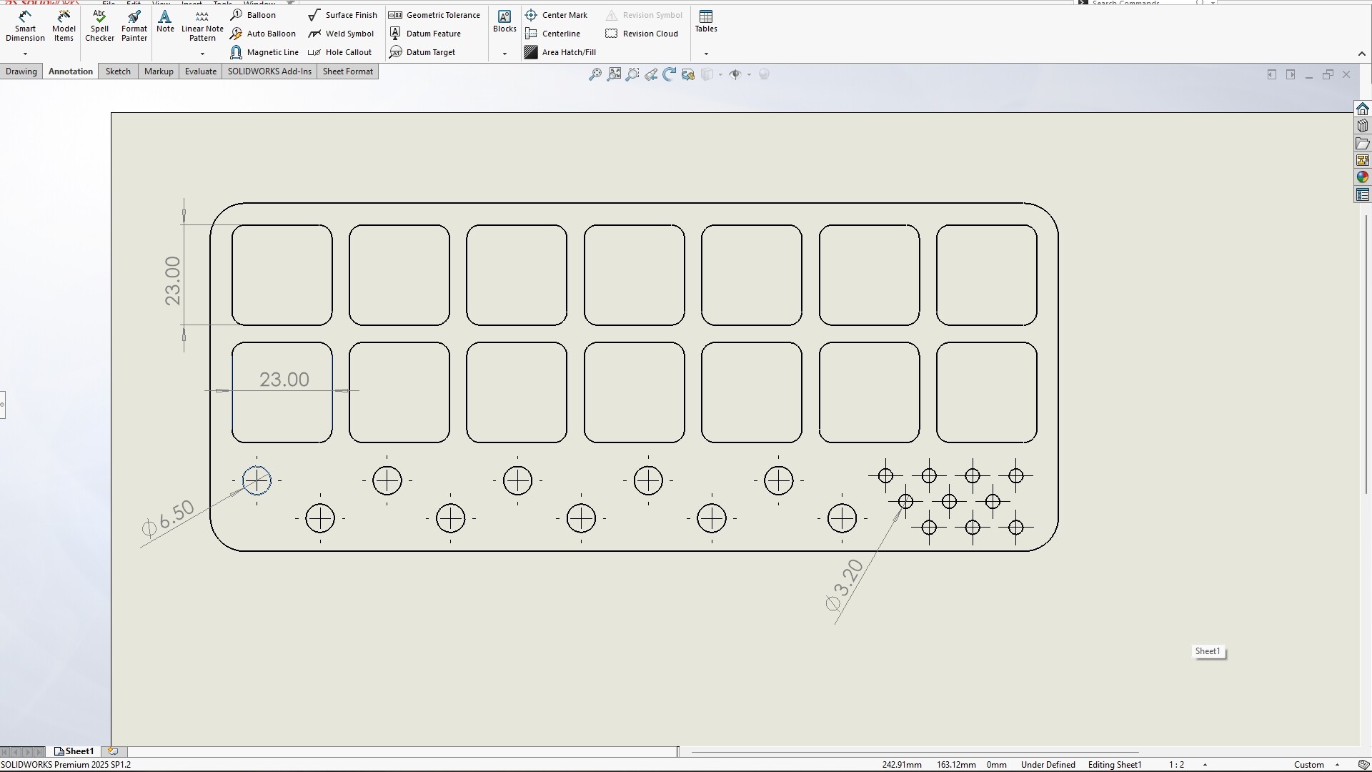 In that test job I was doing earlier, I had a row of holes that intended to hold 1/4” router bits. Those are 6.35mm shafts, so I modeled the holes as 6.5mm dia. to allow a little clearance.