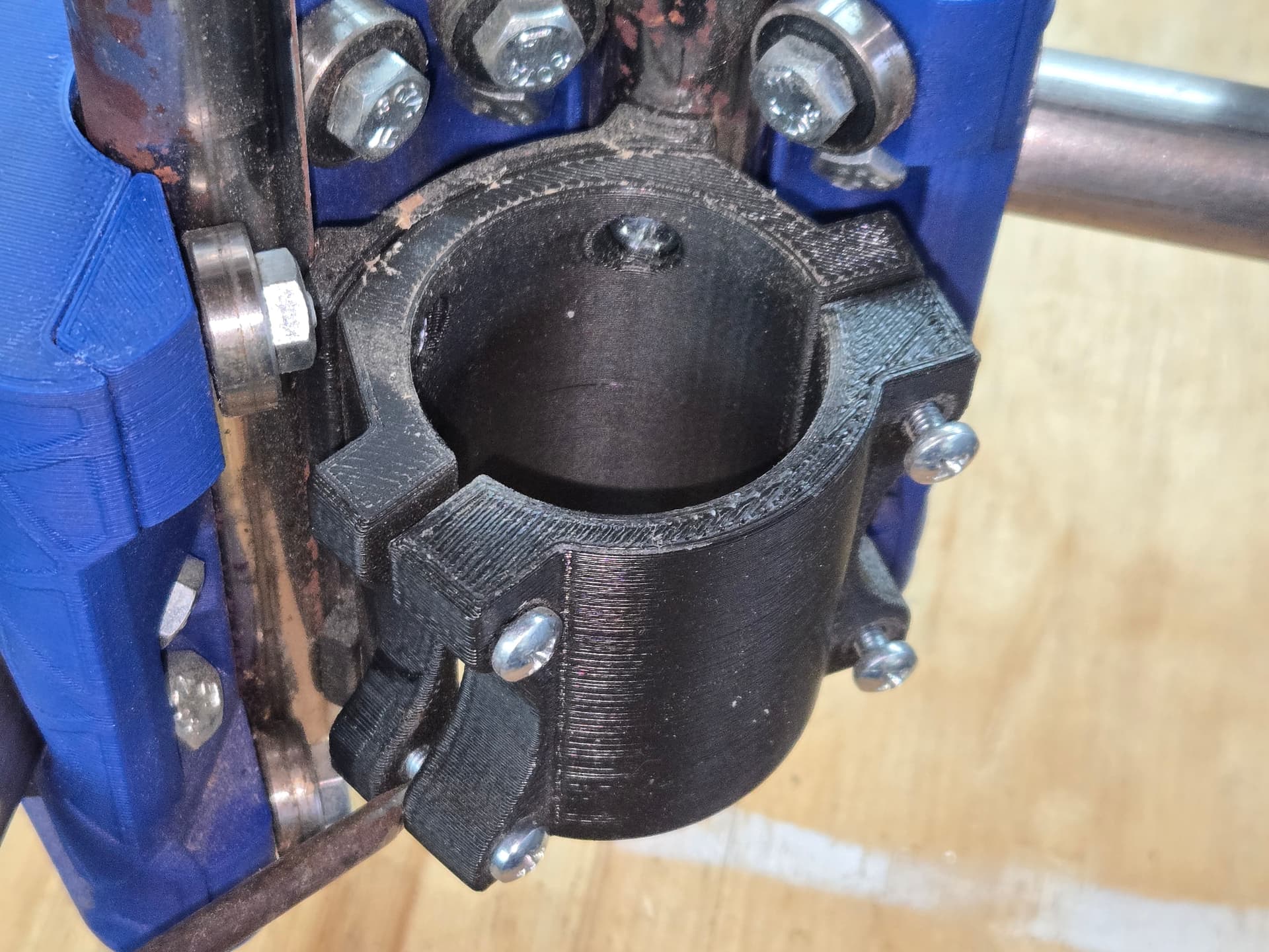 Upon closer inspection, I realized that my spindle motor was slipping in the mount! I tried tightening it up just a little, but one screw (bottom left) wasn’t getting snug. I saw immediately that the rear side mounting ear was cracked. I superglued it back in place, but I have no real confidence that it will hold. I figured I’d just print a new mount, but I can’t seem to identify the right parts… I found this mount, which seems to be correct, based on the name, but it looks a little different than my current one.