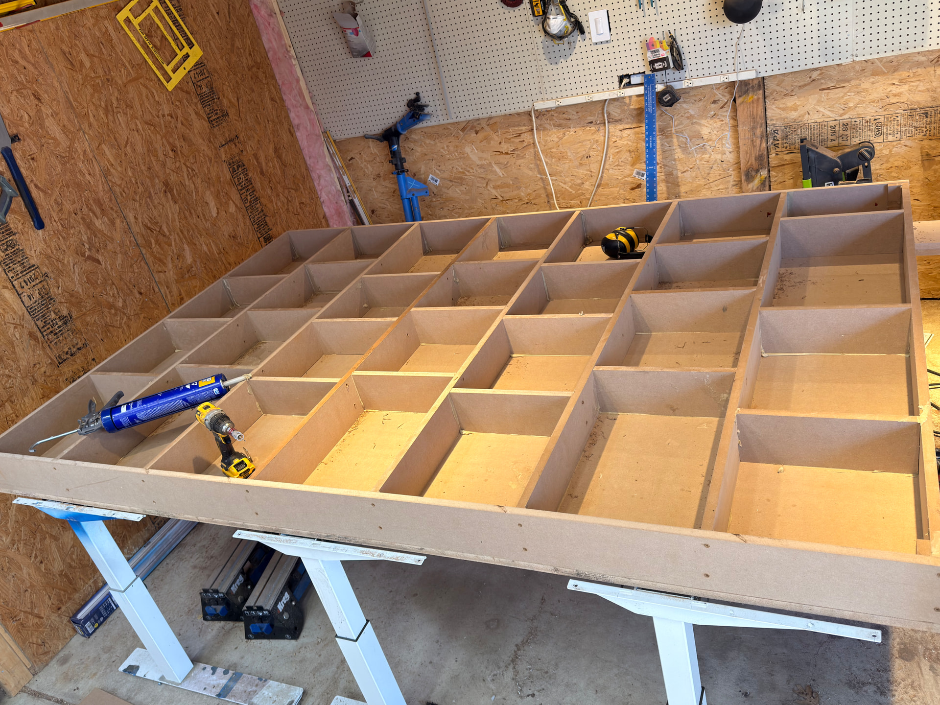 Now to finish clearing the area, finalize computer placement so I can throw sheet goods on there easier, lower the legs to a not-insane height, and move to true mechanical and digital squaring.