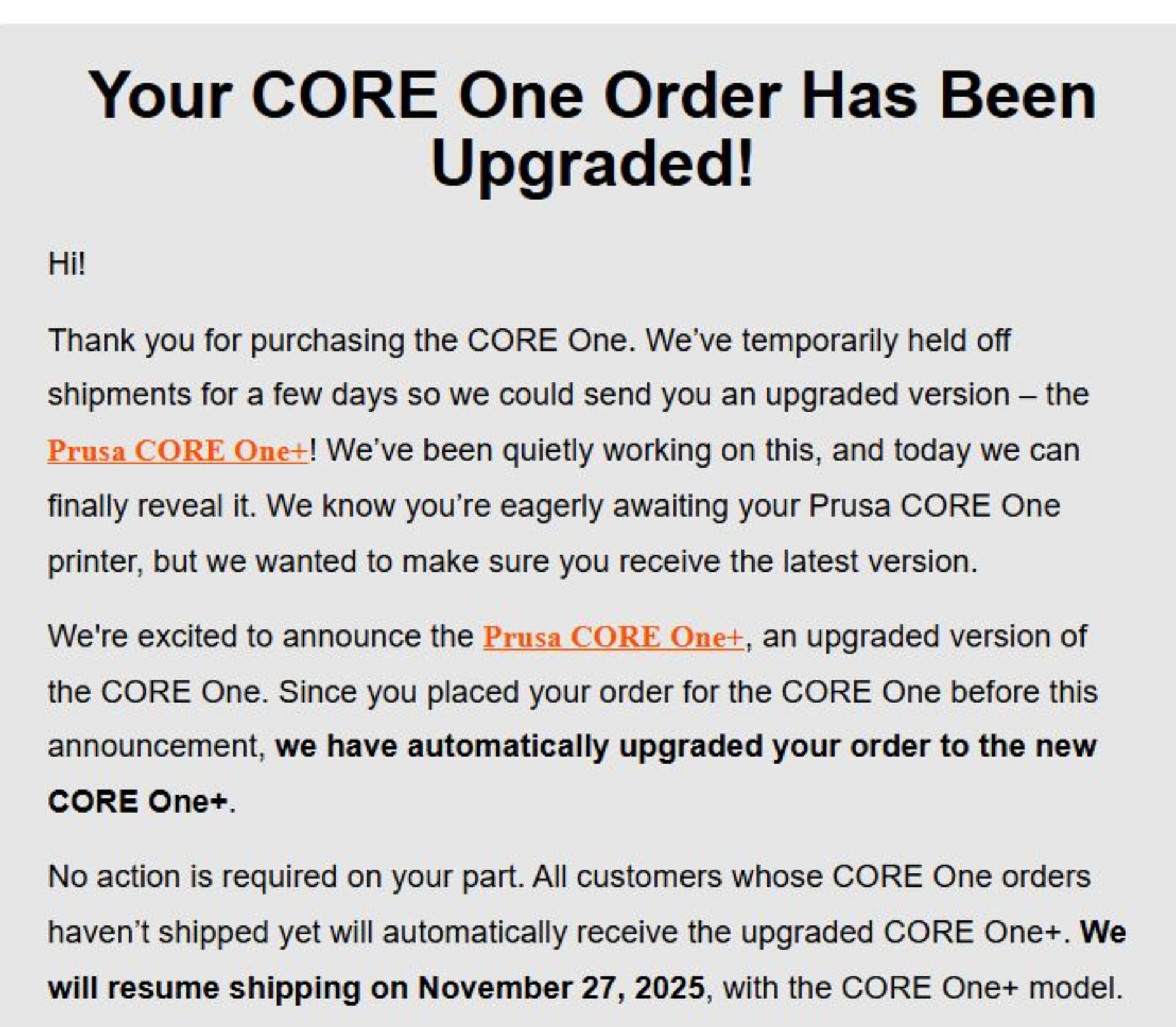 Prusa isn’t super great about providing build/shipping status, are they? Still waiting impatiently for a shipping notice for my Core One L.