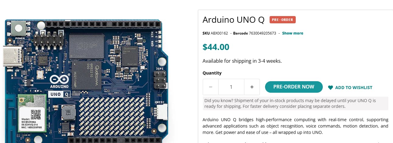 The Arduino UNO Q is now available to order in 2GB/16GB form from the Arduino Store and official resellers at $44, with shipping beginning on 25 October; the 4GB/32GB variant will open for orders in November at $59 with a view to shipping “by end of year,” Arduino has promised.