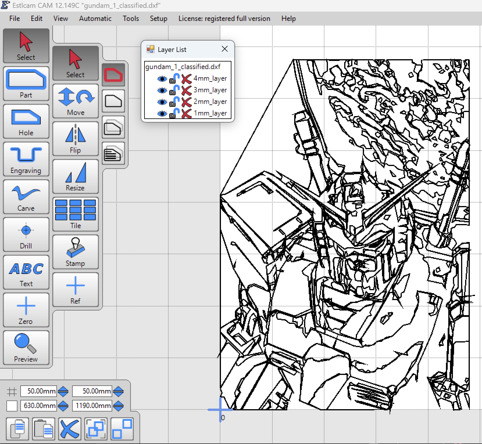 File → add 2mm.dxf ← This is my problem. Whenever I Add another DXF, Estlcam seems to pick some distance away from my origin to render the added file. I want it to open at the same origin point as the original file/rest of the job. Because of this, I can’t really align my layers.