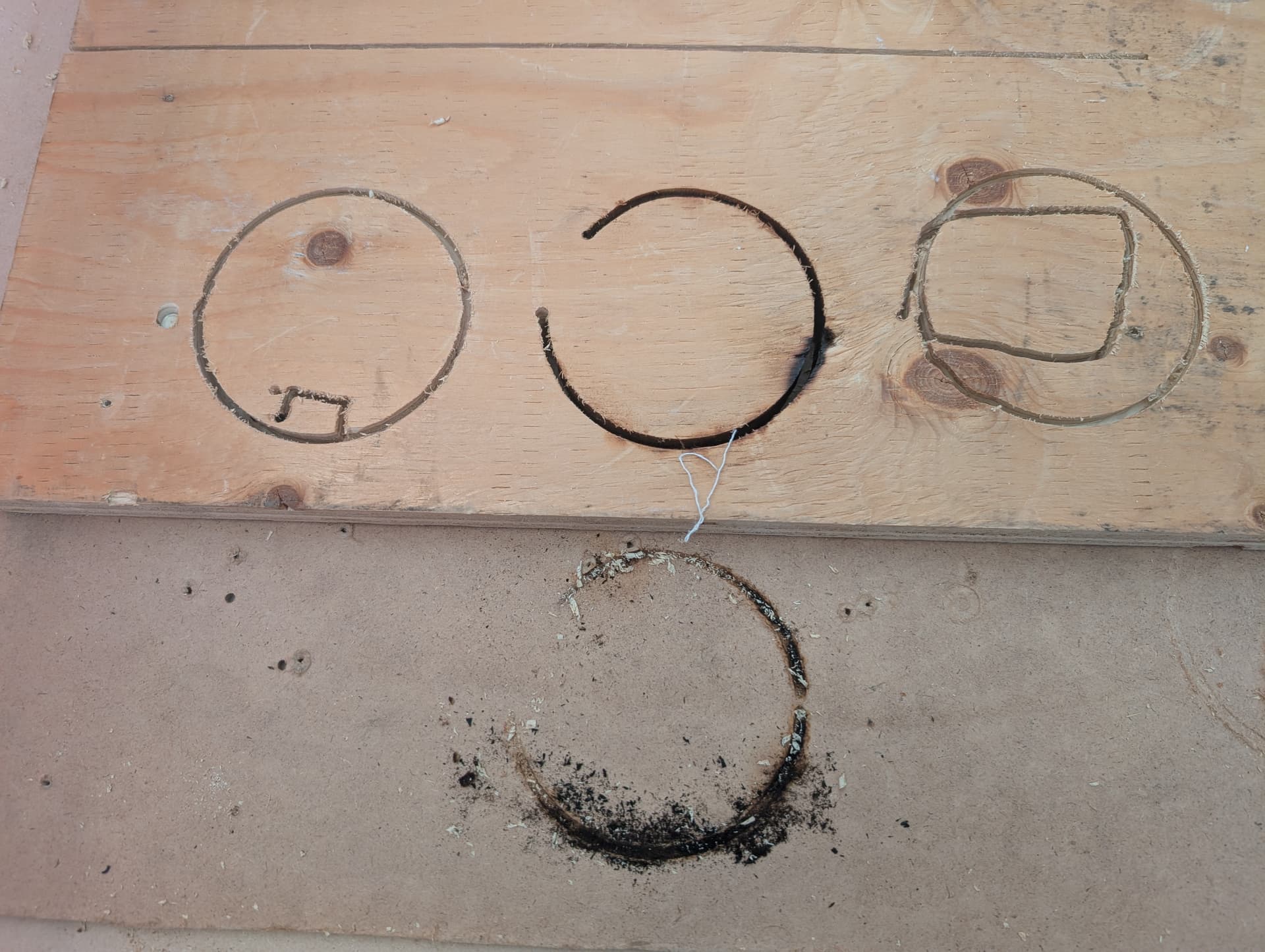 Some of the test cuts were very small diameter through-holes, and the bit was using the flat end more than the sides to cut the holes, generating a lot of heat.