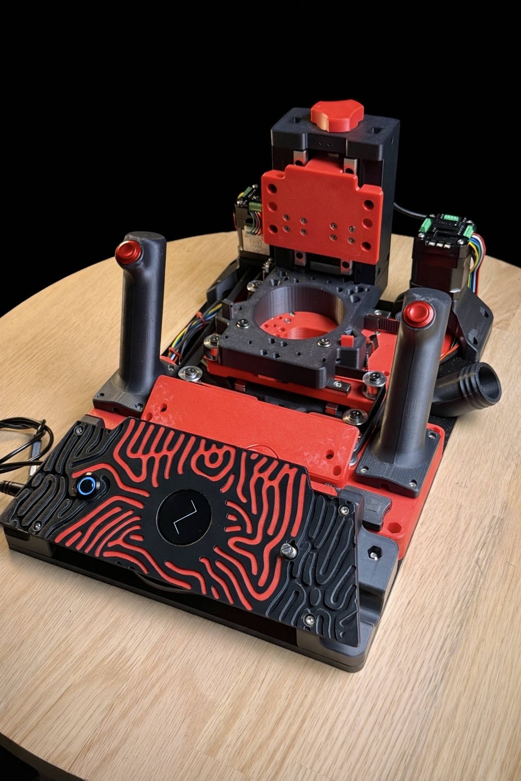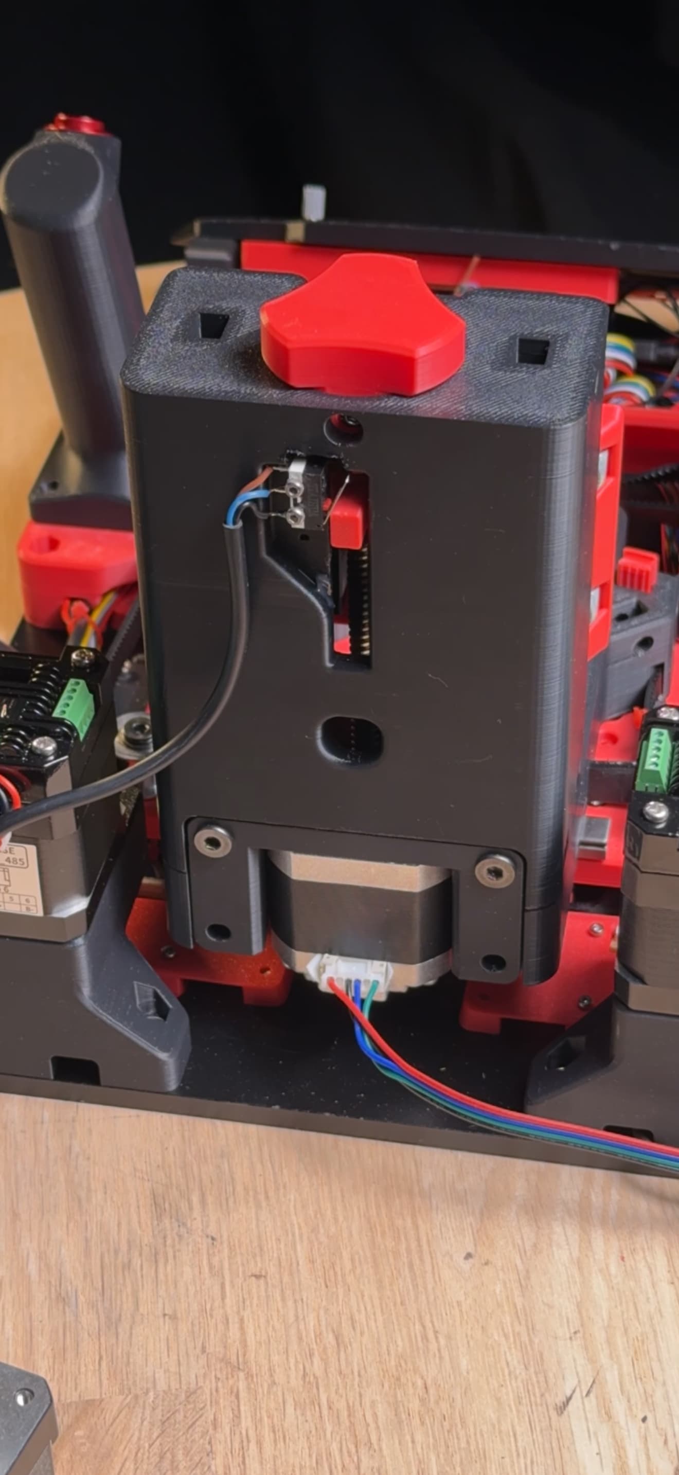 The red and black colour scheme, inspired by a redback spider, has come together nicely. For motors, I tested closed-loop NEMA 17s on X and Y to prevent step loss. One fixed-lead NEMA 17 at 1.5A wasn’t strong enough, so I’m upgrading to a 2A motor. Running one onboard tmc2209 driver alongside two closed loop drivers has worked without issues so far.