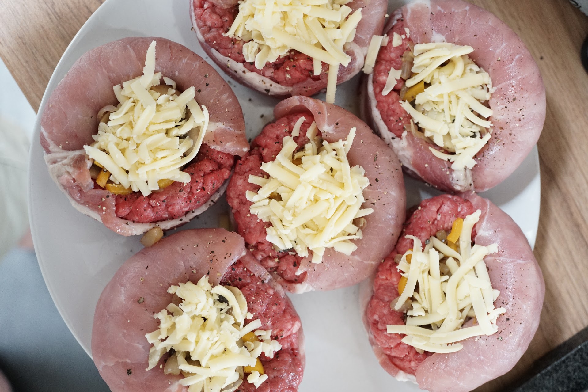 Beercan Burgers with bacon and filled with pepper and mushroom