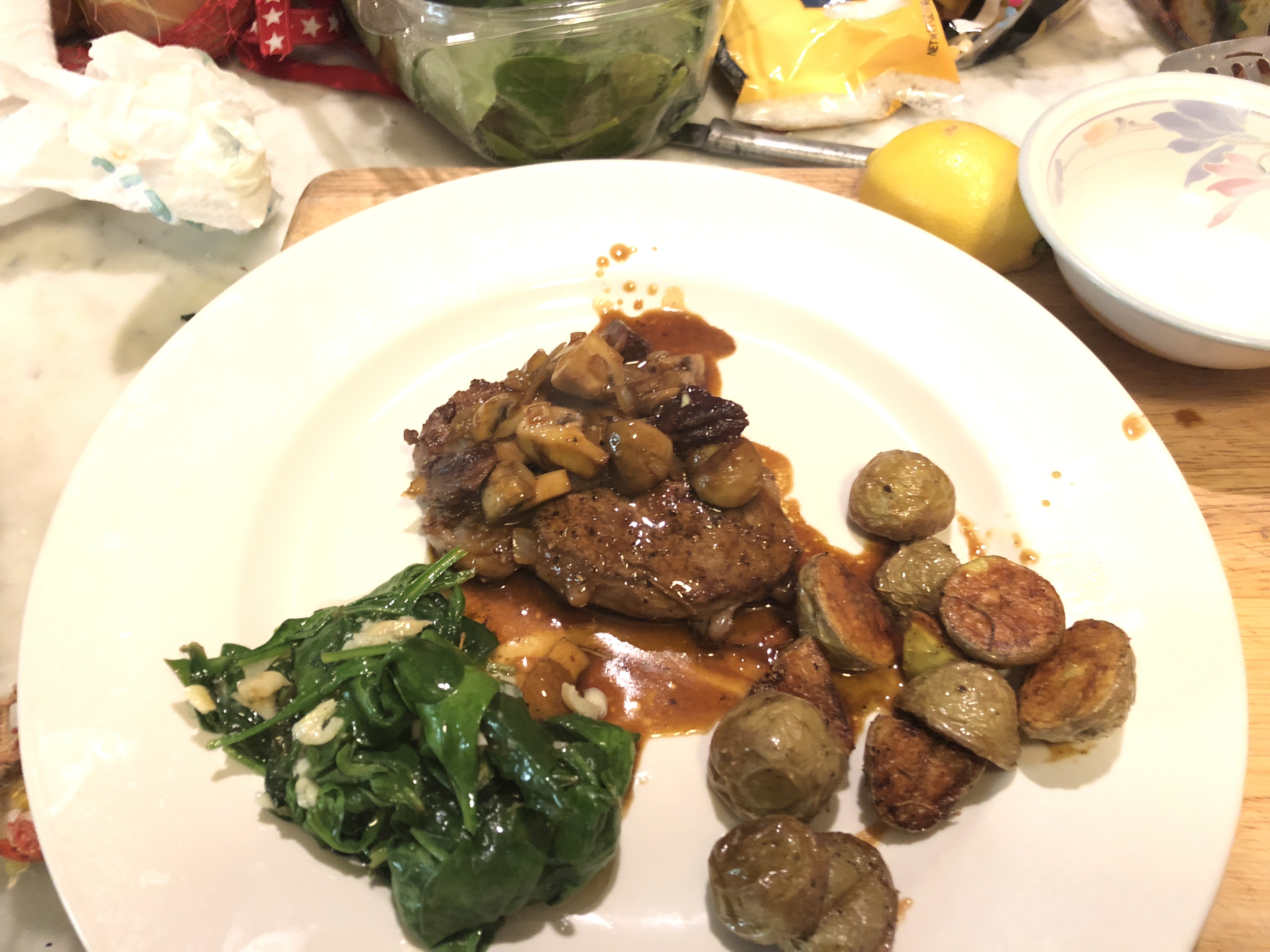 A little cognac and mushroom sauce with the demi glace on a filet of beef. Roasted potatoes and some nice lemon/garlic spinach.