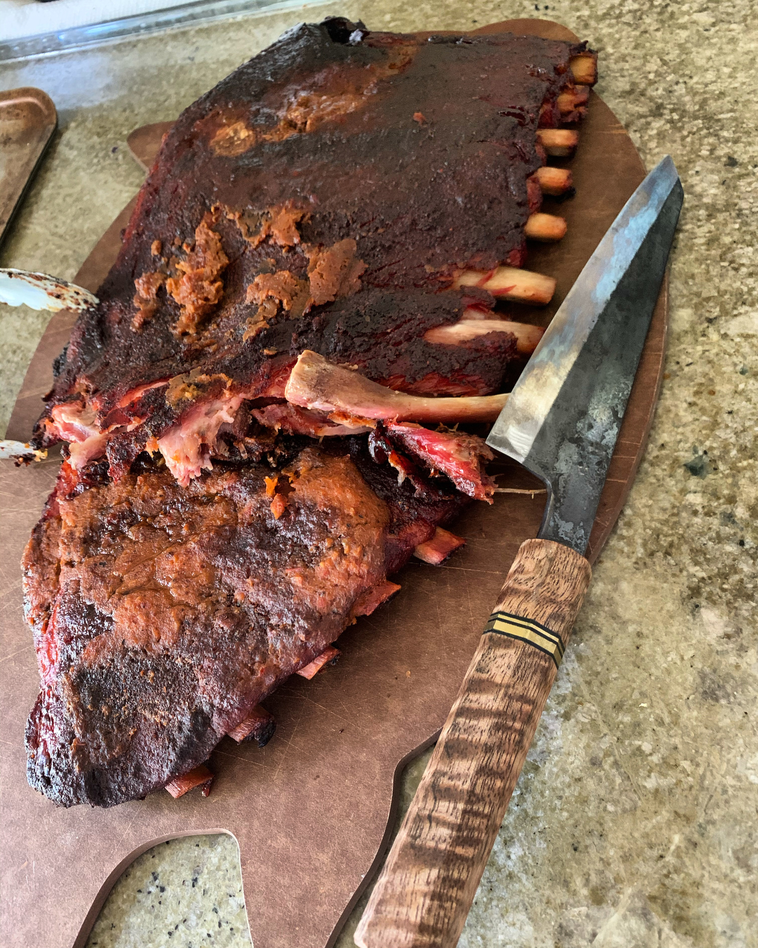 The ‘smoke’ setting on the pellet smoker doesn’t maintain a certain temperature. You have to do more of your cook based on the temperature of the meat and less on ‘time’. What I’ve discovered since that first cook is to let it run on ‘smoke’ setting until the meat hits around 130-140F, then set the temperature on the smoker to 225F to finish out the cook. The smoke setting fluctuates anywhere from 170F all the way to 210F depending on outside air temp and how breezy the weather is. My last few racks of ribs have come out quite well. Just a little pull to the meat. Very juicy. I personally don’t like them falling off of the bone. I’ll do pulled-pork if I want that.