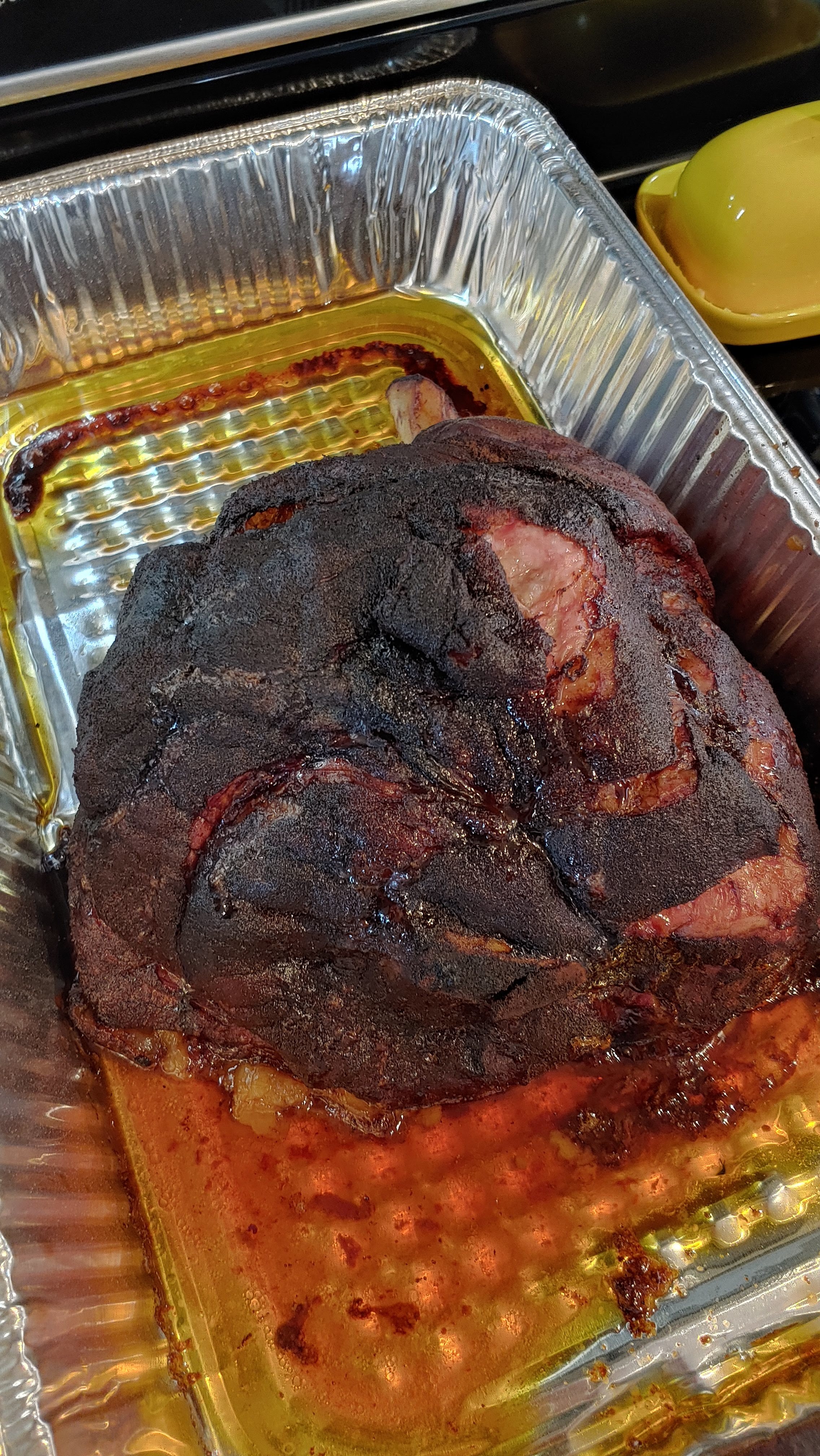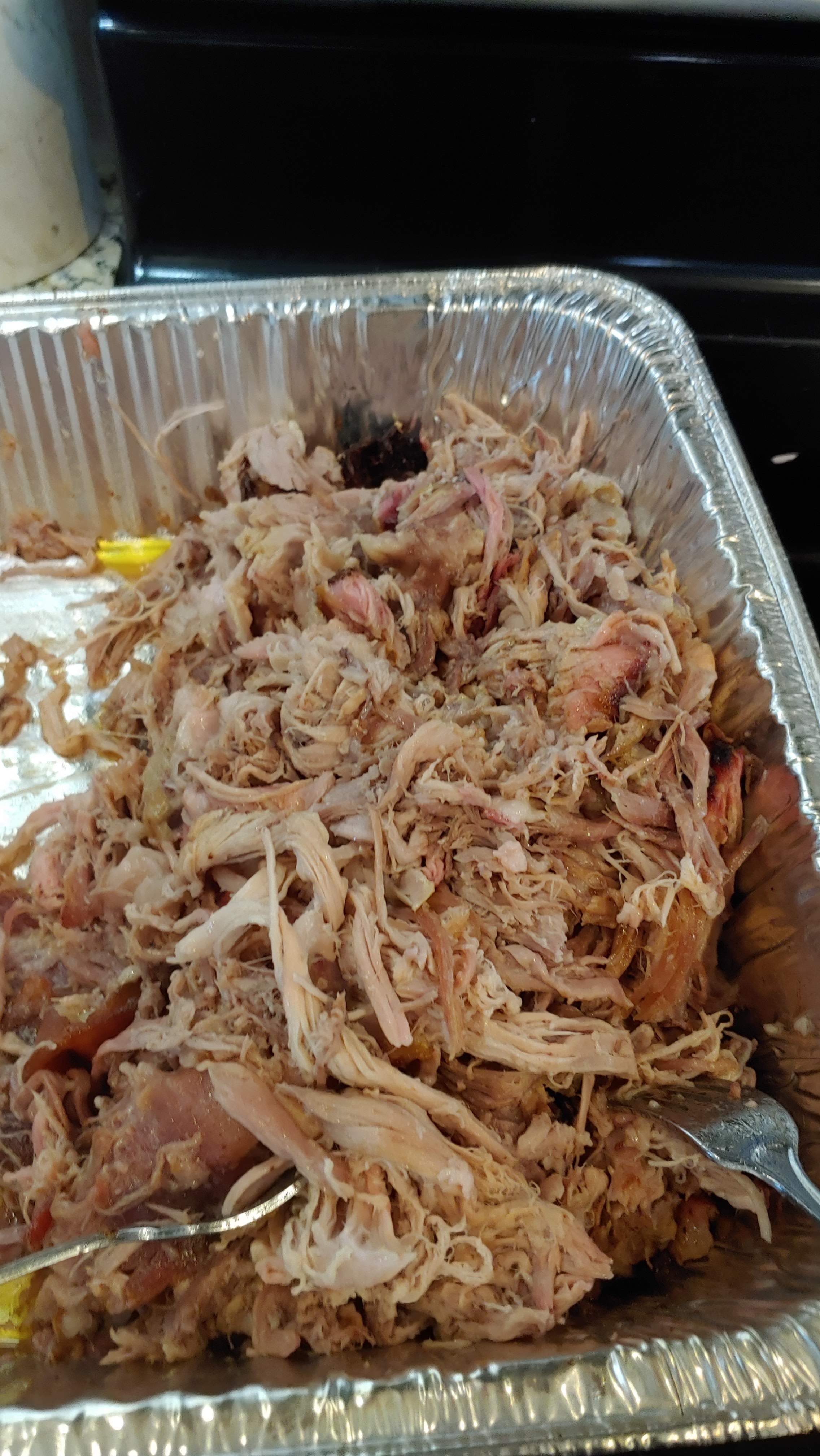 Spent the day building a Chicken Coop. I knew I’d be too tired to cook dinner, so we put a pork shoulder on the pit. I tried something new. When the pork hit 165 I put it in a pan to catch juices. I think I should have tried that sooner.