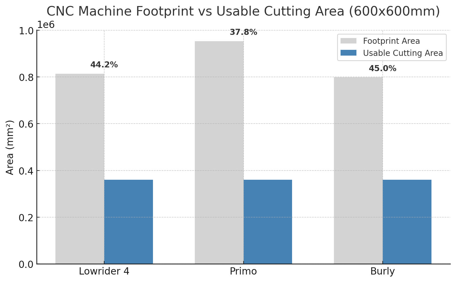 | Machine | Footprint (X × Y) | Footprint Area (mm²) | Extra vs 600×600 (X / Y) | Border per side (X / Y) | Space Efficiency (usable ÷ footprint) |