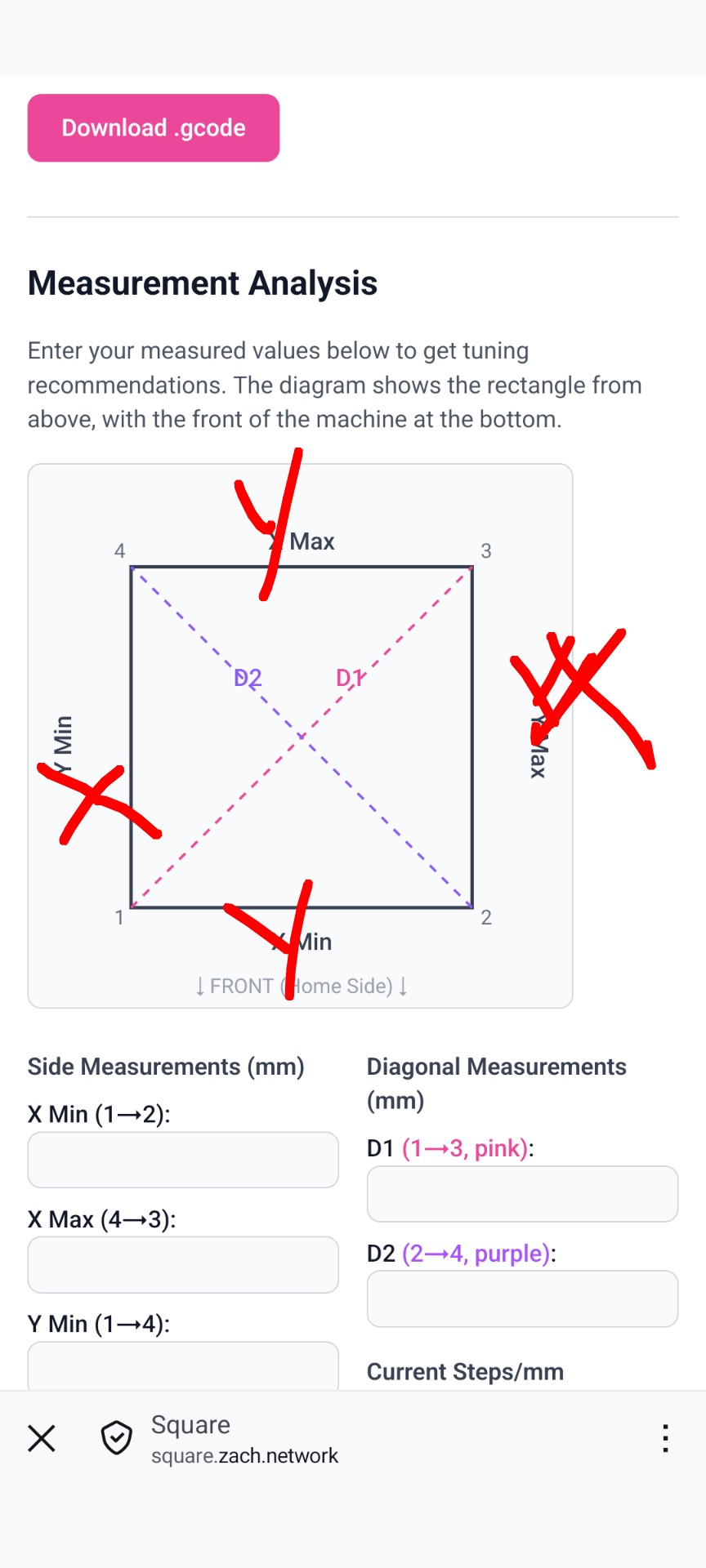 This machine is a parallelogram in the ideal non-corrected case, but belt tension and build errors can lead to sides being different lengths. Since the X gantry won’t change size (…hopefully?) this means there’s no physical possibility of perfect squareness.