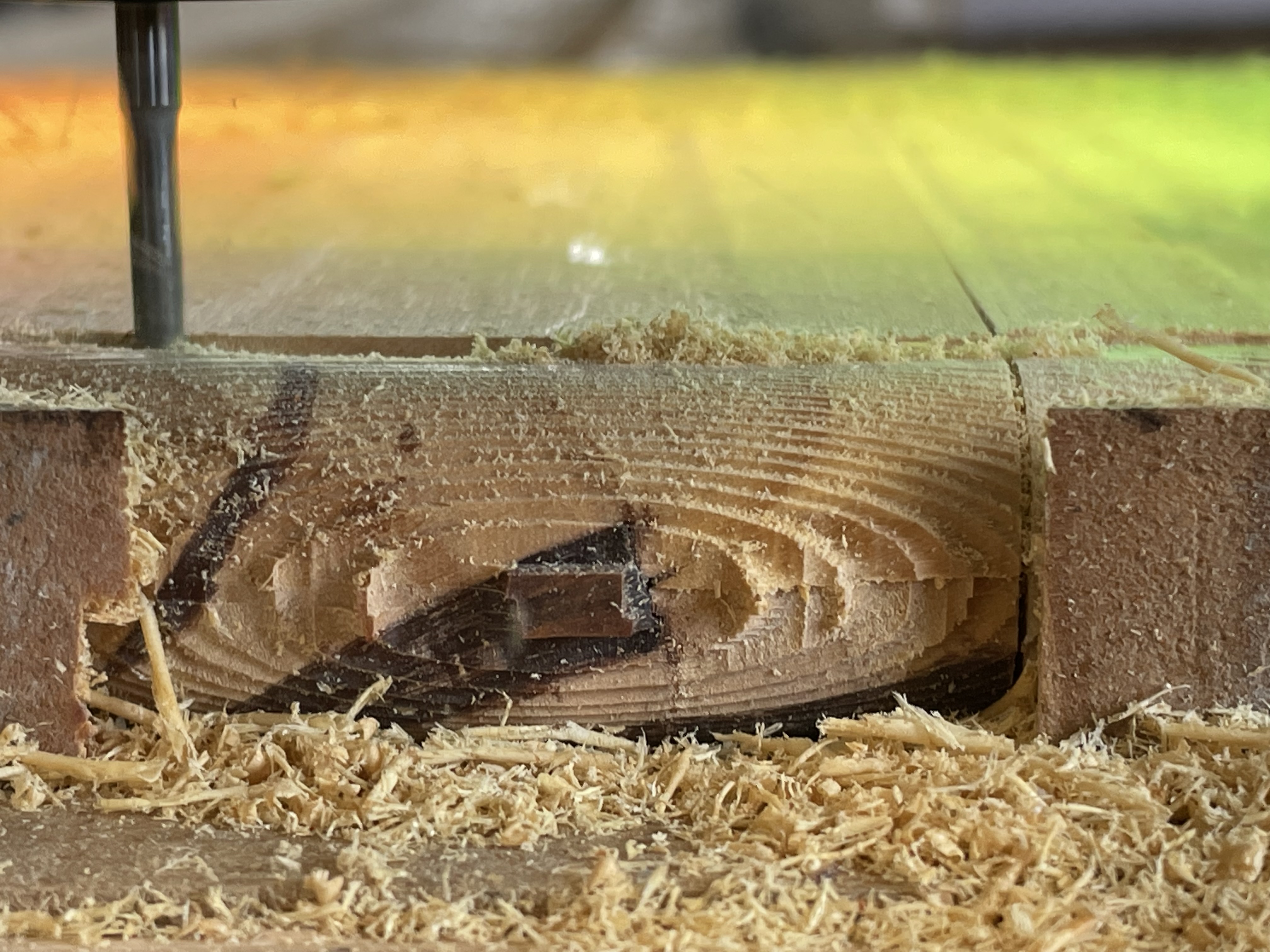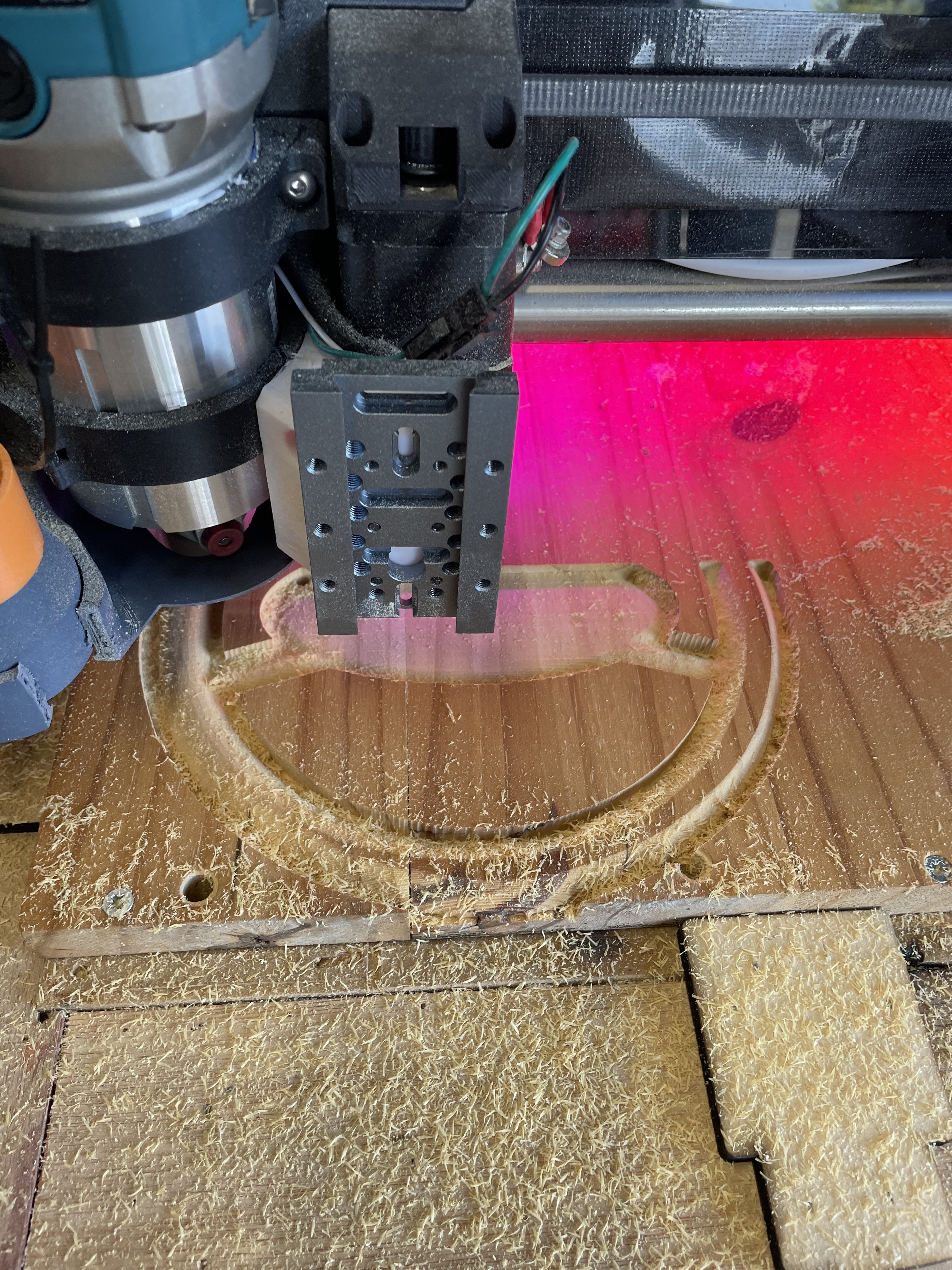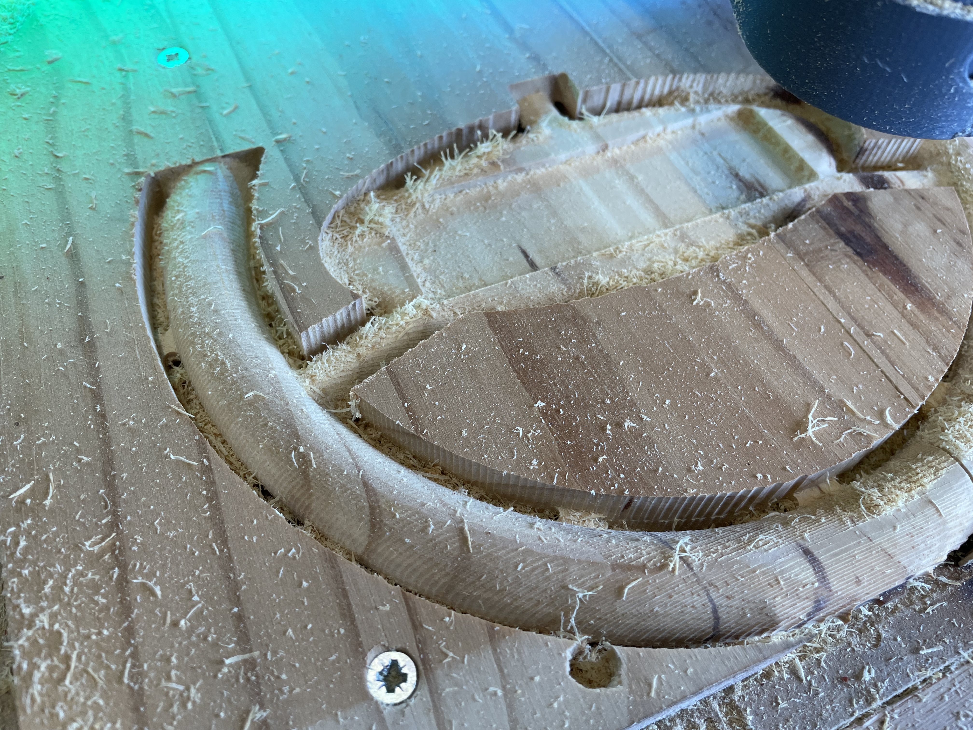 It was only after I started I realised my spoilboard had lifted on one side - I corrected it for the back side cut. I didn’t bother with a routing pss just a 15% finishing pass step over, 3mm DoC and 12mm/s feed. Speed 2 on the router which is not only easier to listen to but keeps the chips from flying too far.