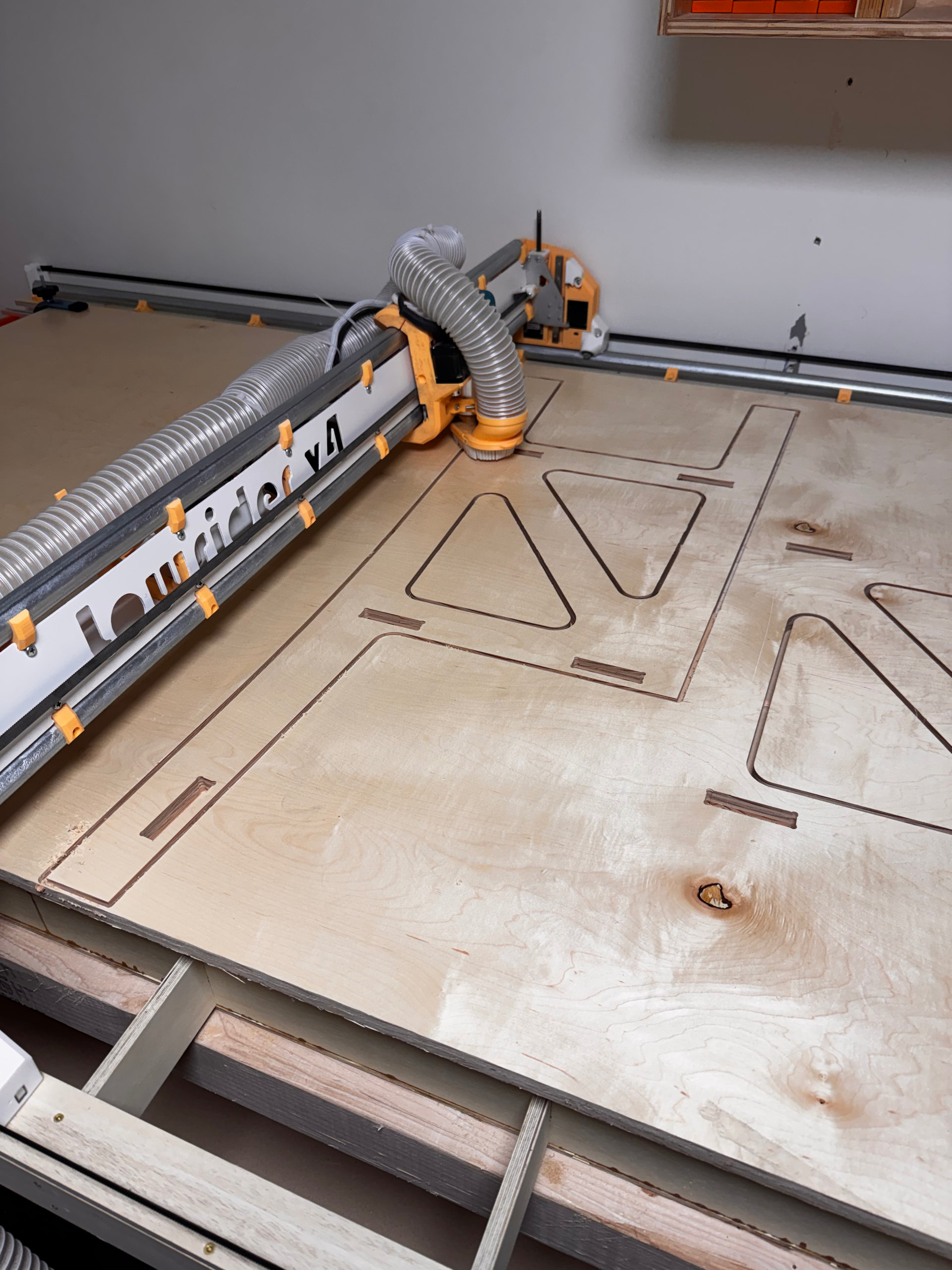 And then time to cut! Pretty quickly, I realized I’d forgotten to put tabs on some critical pieces. Rather than do the “right” thing and go back upstairs to amend my drawing, I downloaded the GCode and added some strategic M0 instructions to let me fish out the interior pieces and then continue the cut.
