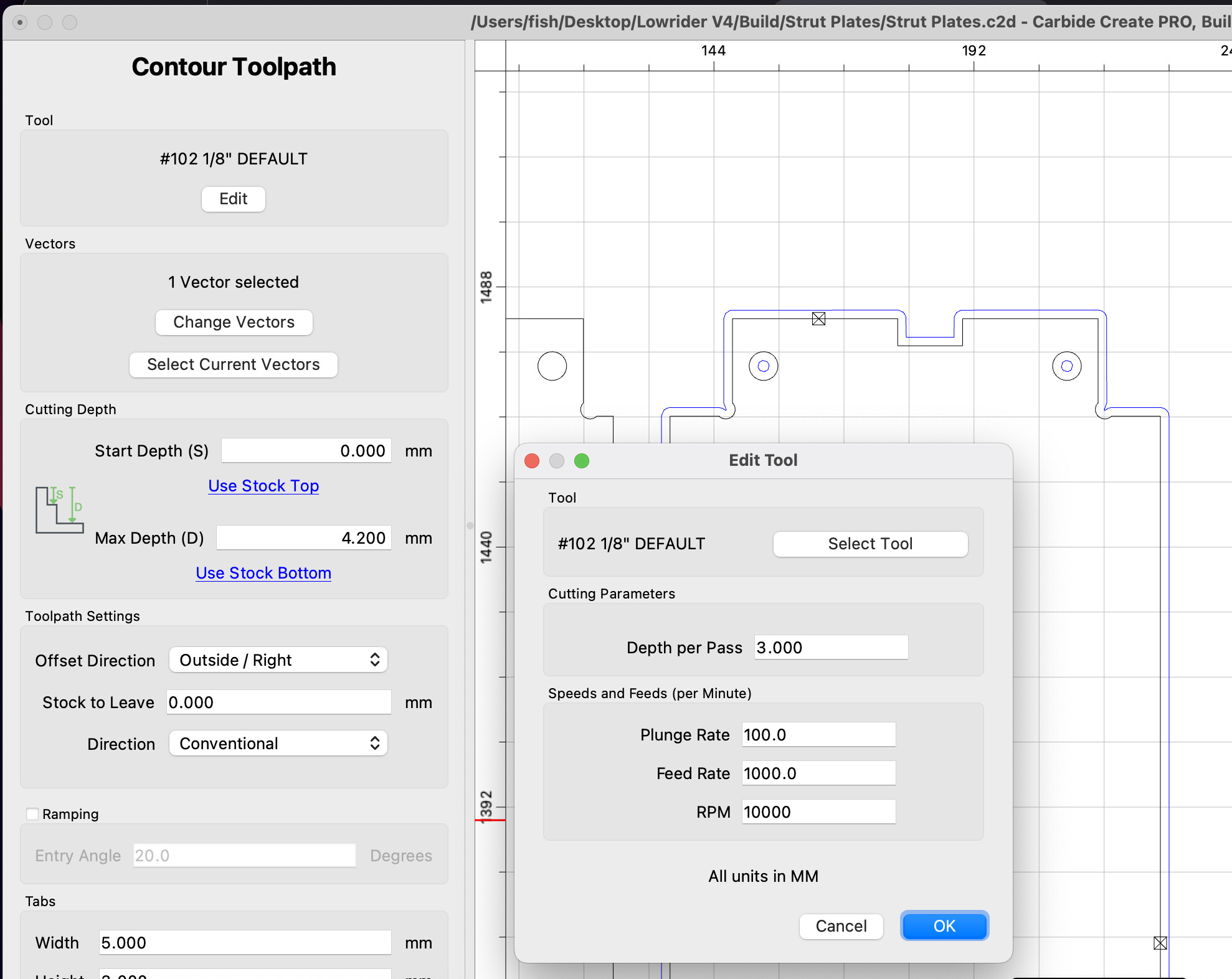I’m using Carbide Create for CAM on a Mac. Keep in mind the photos of the test strut plate are me holding it on top of the existing temporary plate and hardware. CAM settings were for 1/8” two-flute up cut mill with feed rate of 700 mm/min and 2mm depth of cut.