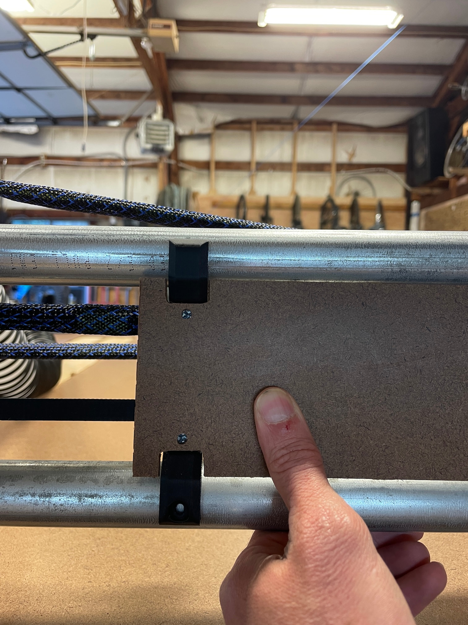 It was cut using a 1/8” two-flute up cut mill at feed rate of 1000mm/min with speed “2” on my Carbide ER11 router. The length/size appears to be good. Dog bones and inside corners didn’t come out clean, but it will fit on the gantry brackets as-is.