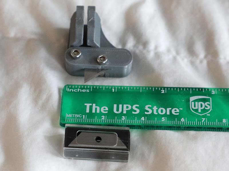 I picked up a box of 200 Husky heavy duty utility knife blades from Home Depot for $10 & a box of 10 mini utility blades for $1.59 at harbor freight. The heavy duty blades measure .65mm thick which is about .05mm thicker than the Stanley blades I have & it does fit into this blade holder mount. The notch side measures 1.6mm longer than the Stanley, but the cut side seems to be the same length. The width is the same. I might look at tweaking the design to fit these blades better, but might be good enough. These 200 blades might be a lifetime supply for me unless I start cutting up a storm.