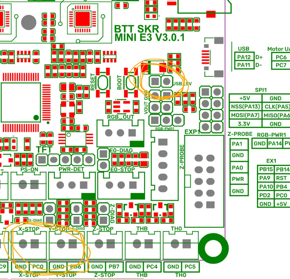 The pinout in the board tells me x and y stops have only two pins. One for signal another one for ground. The endstops have three pins: ground, 5v and signal. Based on that I connect the ground and signal from the board to the endstop and then I connect the 5v pin to the usb 5v in the board: