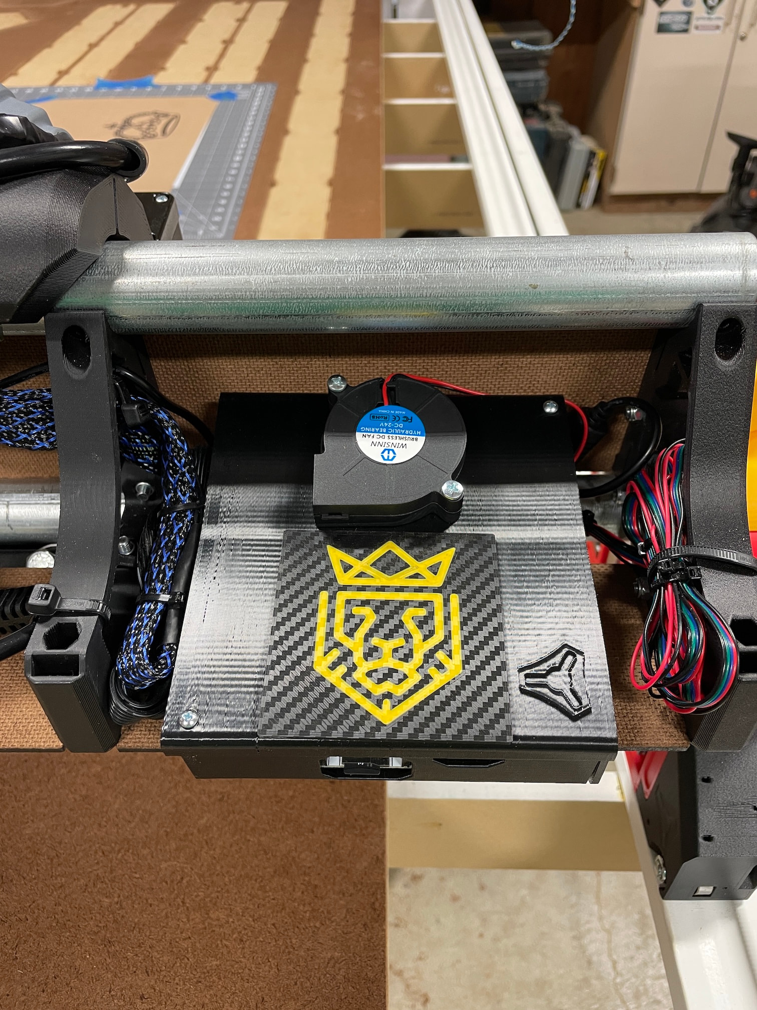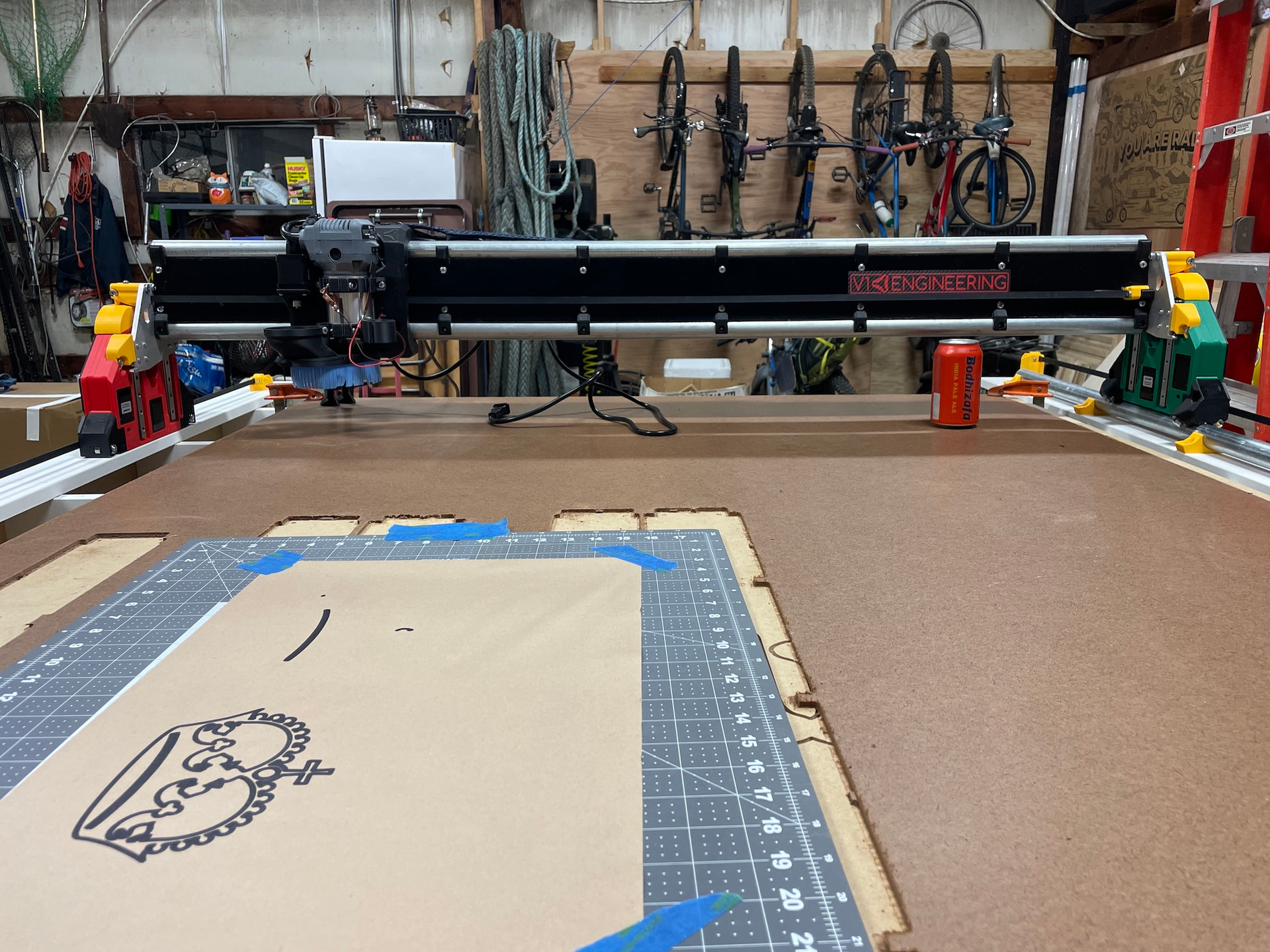 Final assembly went smoothly and I was thrilled to power the machine up, connect via AP and jog the thing around the table. Of course I couldn’t wait to see it draw something…so I skipped ahead a few steps and tried to draw the crown with a sharpie haphazardly taped to the core. It only got most of the way through before the pen fell off, but I was thrilled that this beautiful creation was working! It was time to square and calibrate while I printed a proper pen holder for the accessory mount.