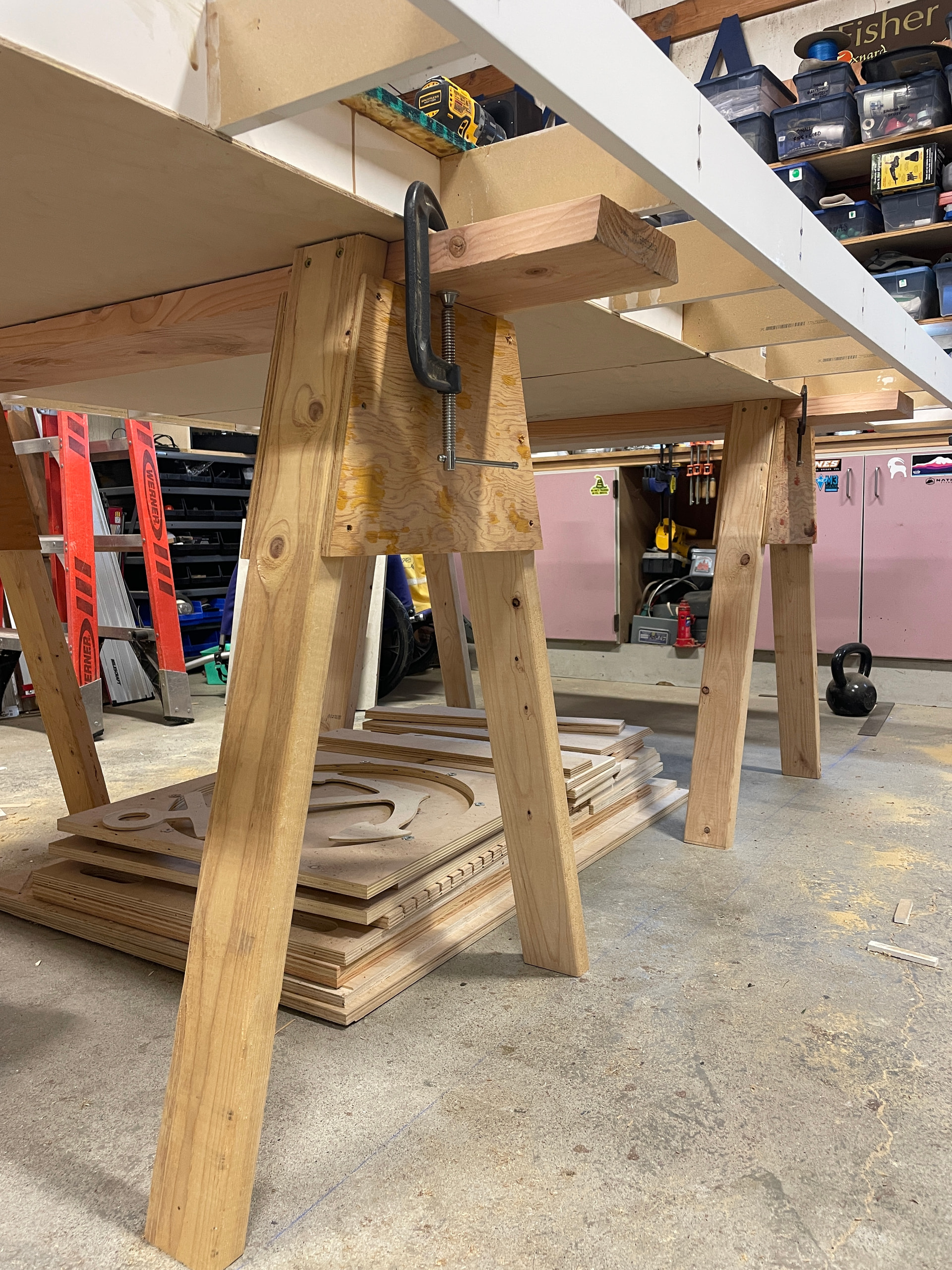 As a hobby woodworker for over fifteen years, I thought that building the table would be the easy part. At first I couldn’t decide on which table I wanted to build and spent way too much time researching the very impressive (but much more complex) folding tables and similar creations shared by very skilled people here on the forums. Once I abandoned plans to build a complex table and decided to go with the table Ryan and others recommend, I still wasted too much time trying to “re-invent the wheel” by coming up with unnecessarily complicated jigs and other distractions. In the end I built a sturdy torsion-box style table using MDF boards with OSB top and saw horse legs, and I’m happy with the result even though there are many imperfections that only I know about and will never speak of publicly. ![]()