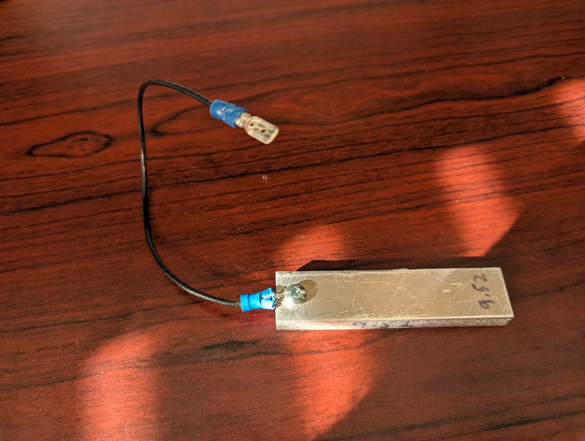 I had a spare piece of aluminum on hand, so I drilled and tapped a small hole and attached a short section of wire with a screw and ring terminal. A spade terminal allows me to remove and attach it as needed, and the wire it attaches to is easily contained by the alligator clip on the other lead.