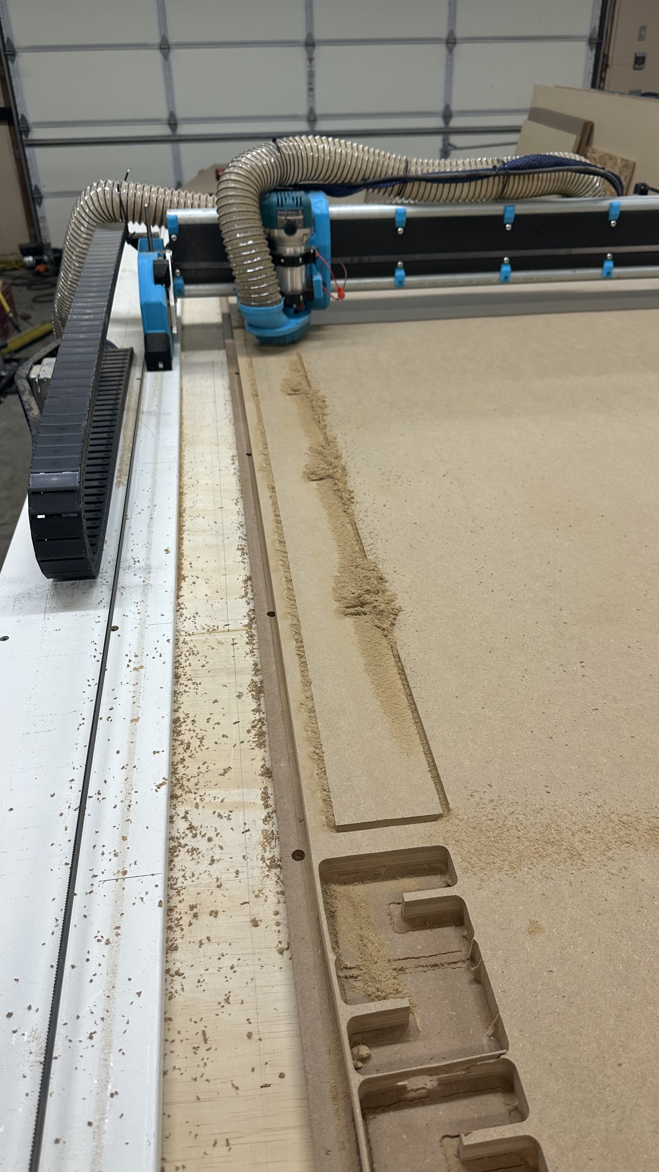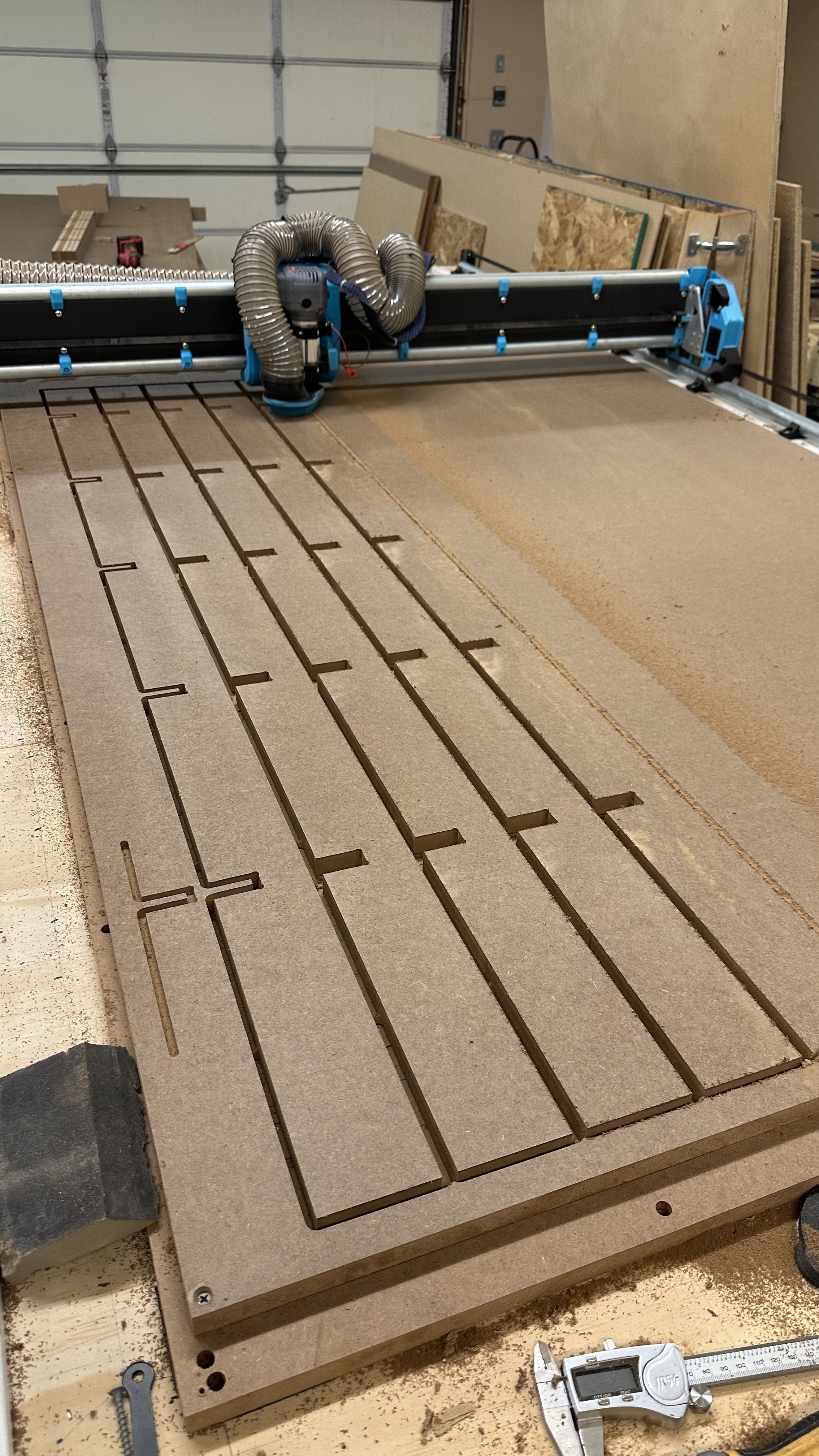 Discovered about 2/3 way through the X spar cuts that I had some wobble on the x rails - enough that I could watch the whole core move in the Y axis direction as the notch cuts were being made. Result was a bunch of pieces with a way-too-narrow notch, so those will get donated to the scrap pile and I’ll start again now that I’ve tightened the rollers to alleviate the wobble. If I only end up scrapping 1 sheet of MDF in this process, I’ll still be happy…