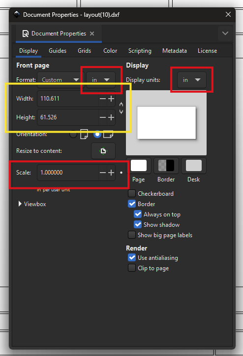 I set the scale to 1 DPI, and the format/display units to inches (if you’re entering measurements in mm on the web tool, try mm.). That’s all the red boxes.