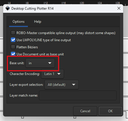 Now, save as a DXF. File > Save As, pick DXF14 in the filetype dropdown. You should hopefully see a window like this where you can pick ‘in’ (or, I guess, mm if that’s what you’re working with) as the unit.
