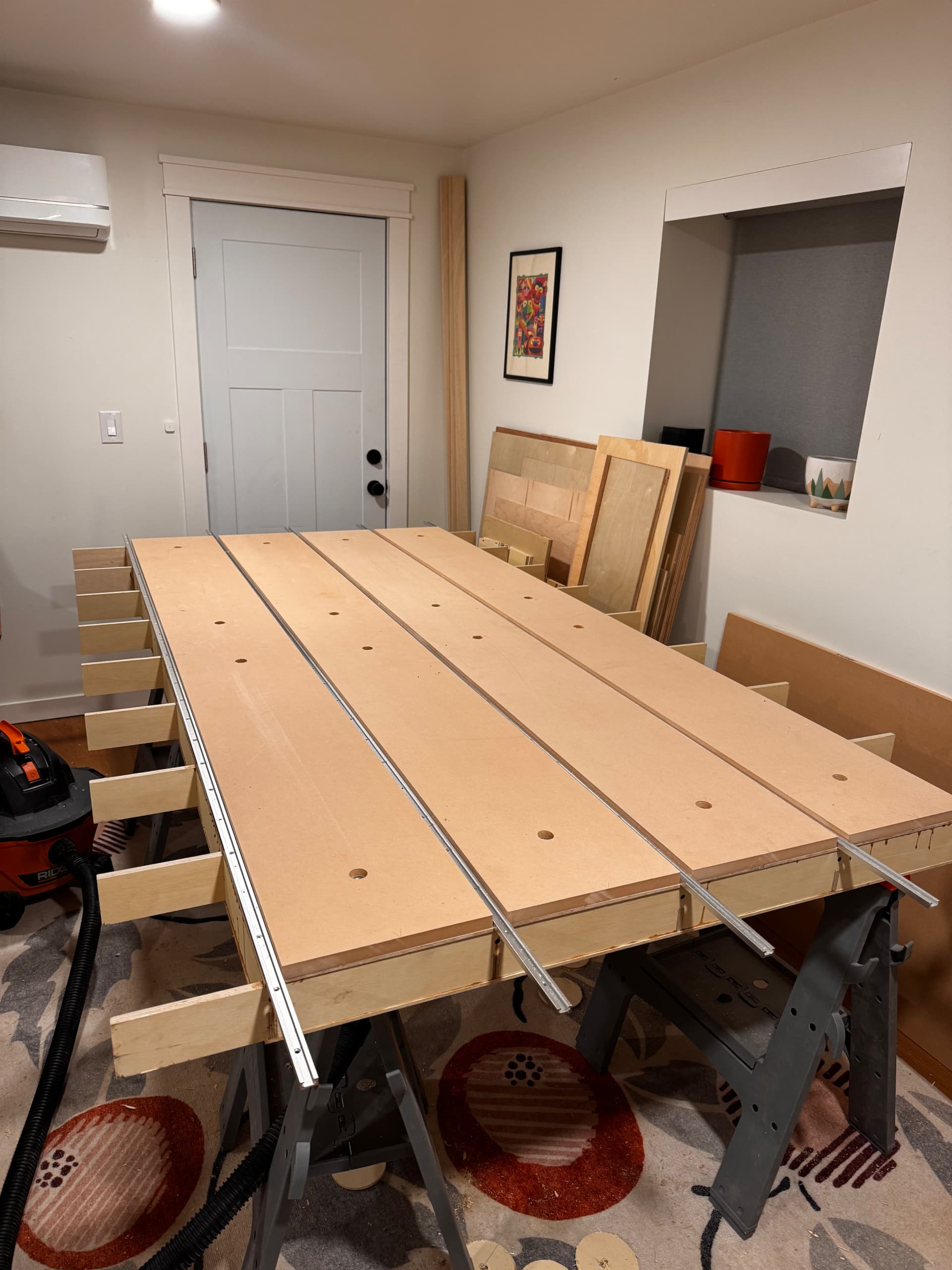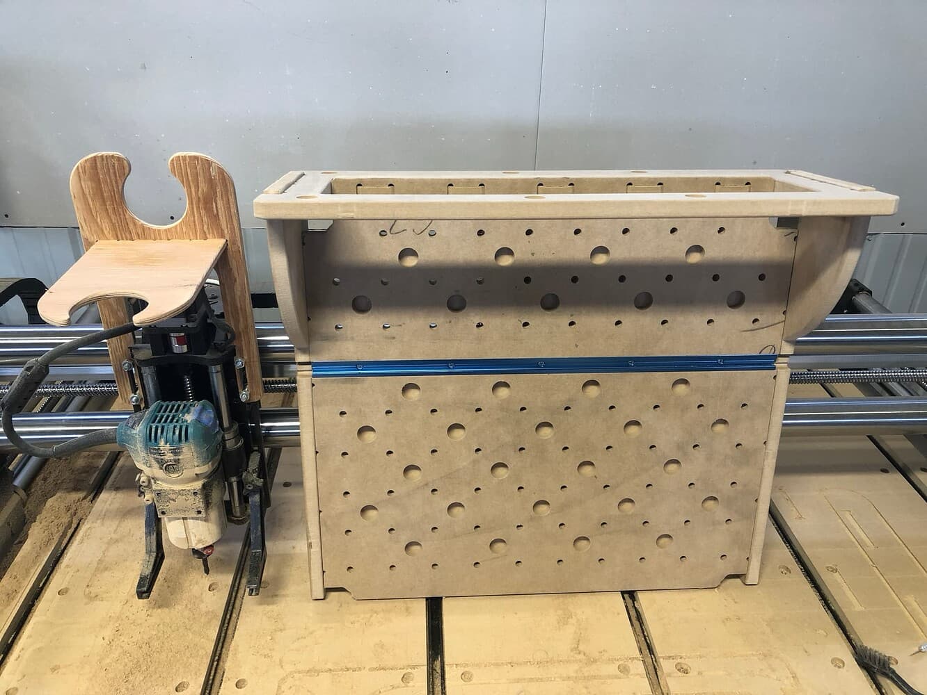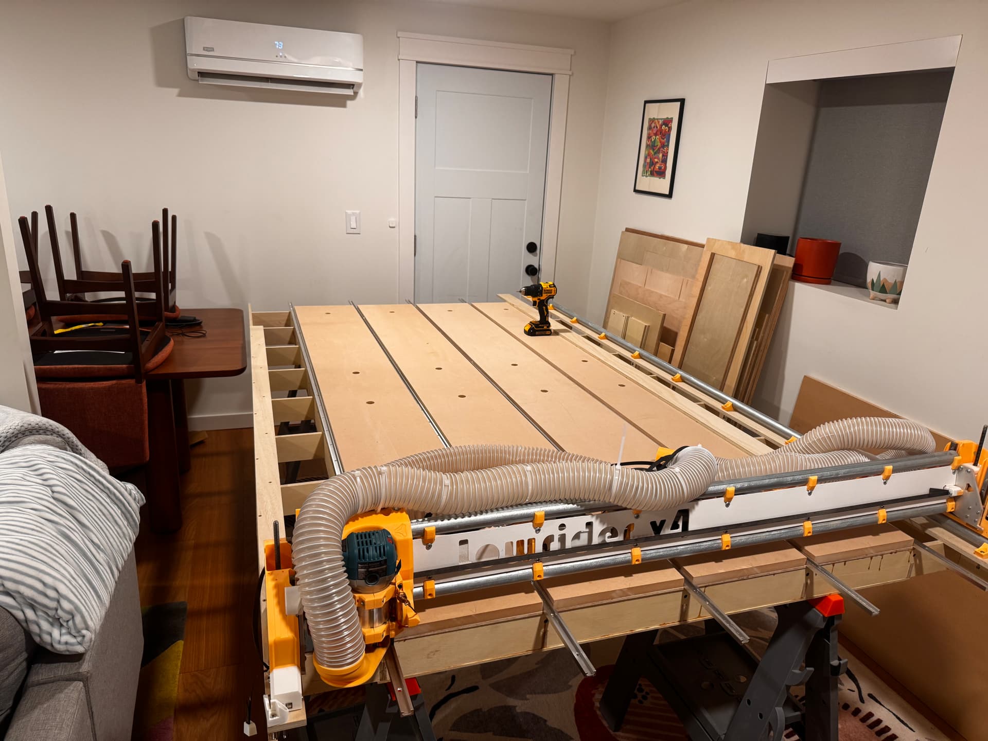 I think I’ll build the table with a thicker top and have the cnc cut holes for threaded inserts and for the rails. I am also looking into putting in a ceiling lift to get it out of the way when not in use.