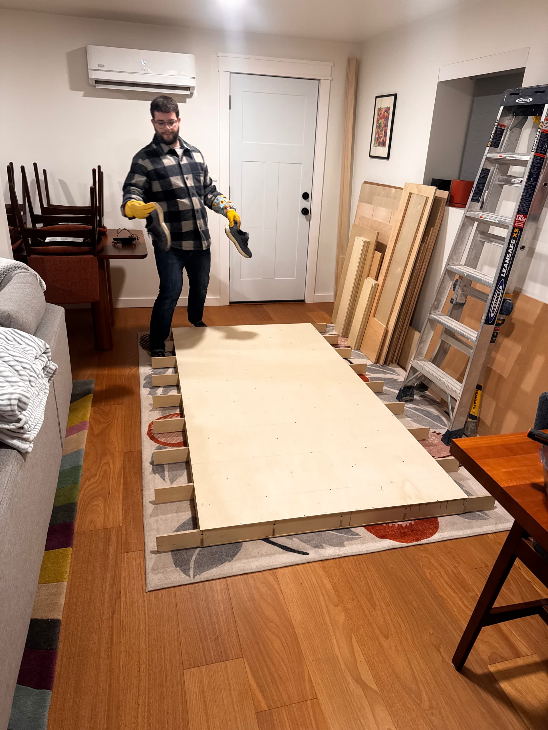 So, because I apparently love building tables, I built a fifth one! Same design, but out of plywood instead of MDF. I also added some work holding and a more removable spoilboard to improve some of the deficits of the first attempt. Most importantly, I assembled and glued the whole thing at a local woodshop with a giant, damn-flat assembly table.