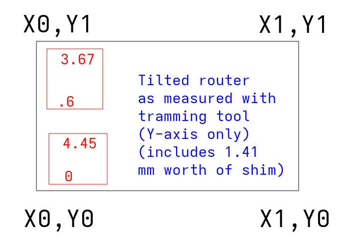 At this point, should I be trying to get the corners and edges of the spoilboard to level off enough to compensate for the different heights of the Z legs? Given the 2nd illustration above, I’m guessing I need 1.46mm worth of shim at X0,Y1, .19mm worth at X1,Y0, 2.4mm worth at X1, Y1, and enough at the 0.5 marks between each of them to ensure it doesn’t have any bowing.