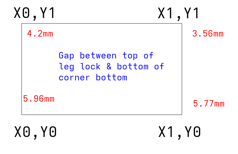 I redid the entire core, trucks, tension, squaring, etc., until I found what I think is my issue - the Z-axis leg conduits are different heights. I went in with the feeler gauges and found these height differences from the top of the leg lock to the bottom for the corner bottom:
