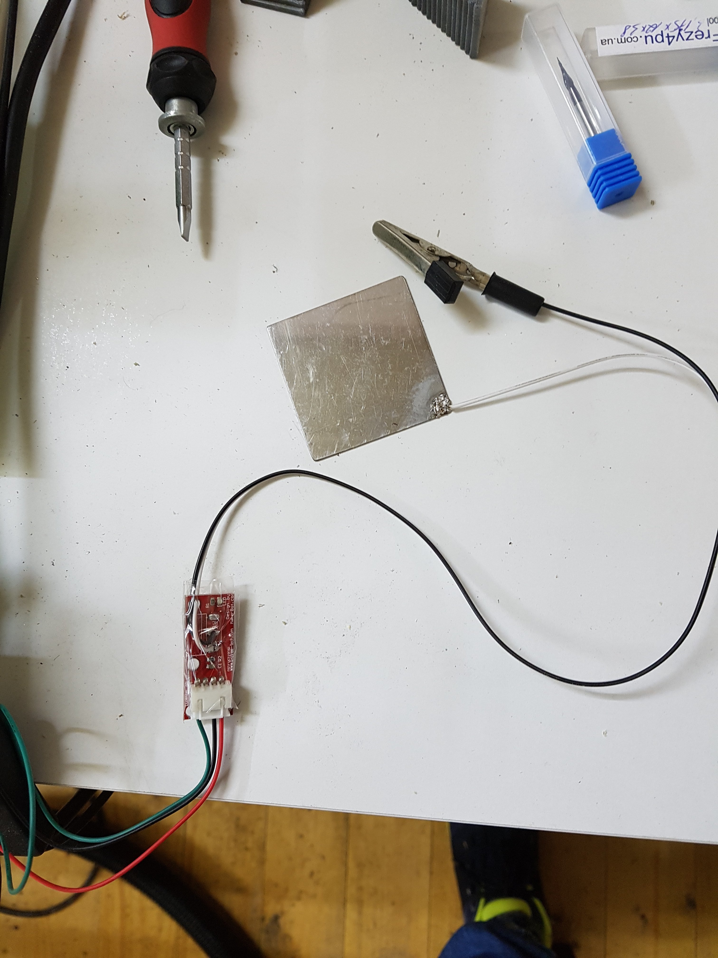 When I connected signal wire to the bit and ground to the plate it was not work at all. Then I twisted connector on the ramps, so now the plate connected to signal and the bit to ground. Usualy it works, but time by time it still make wrong detections, especially when I try to hold the plate with finger (usualy i do it in rubber gloves).