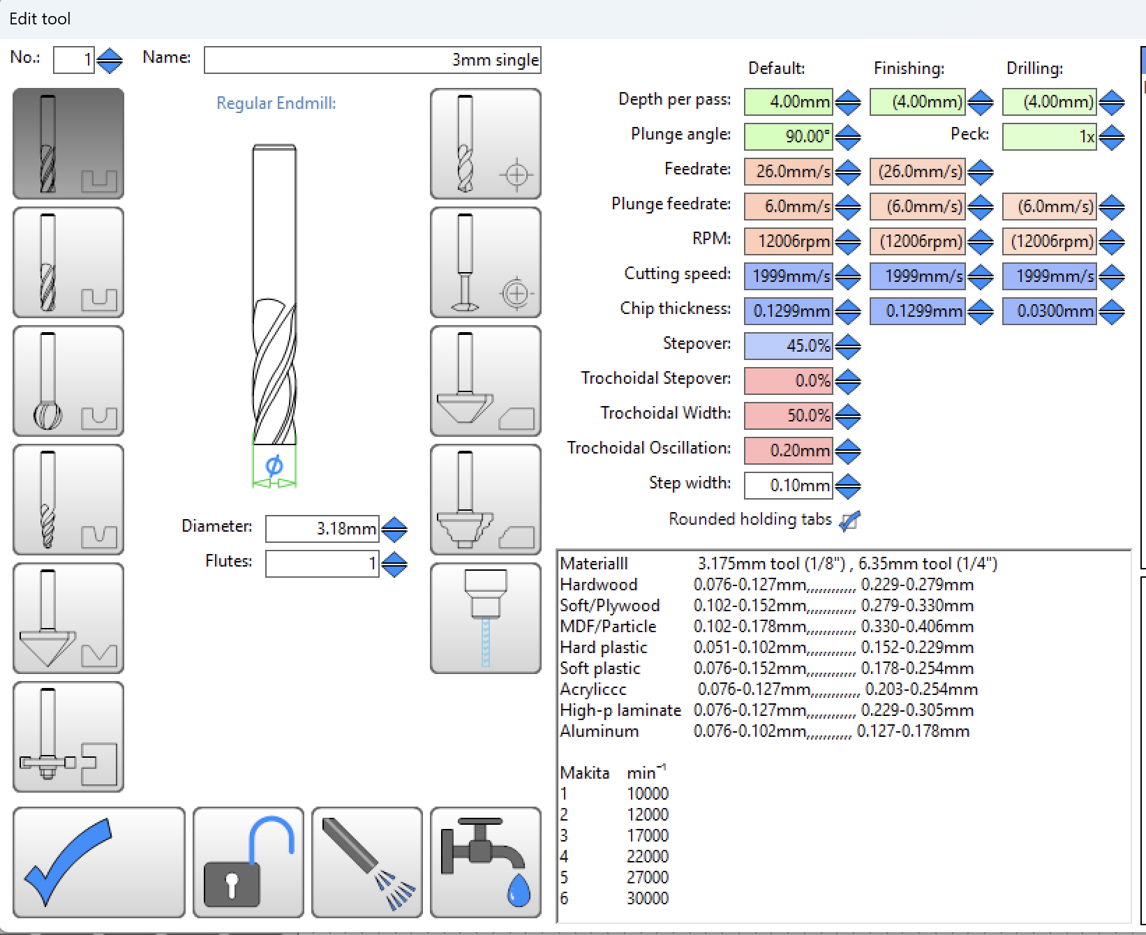 Table taken from the following guide, which assumes DOC = 1x tool diameter.