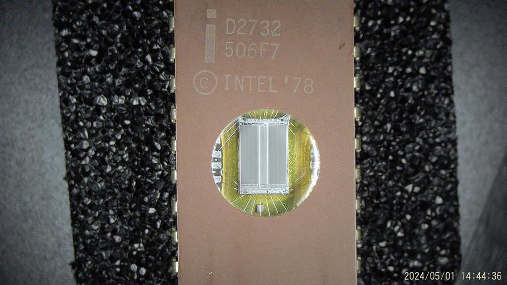 View of 32K EEPROM memory with camera backed all the way up - no digital zoom. This old type of memory was erased by exposing chip to UV through the quartz window.