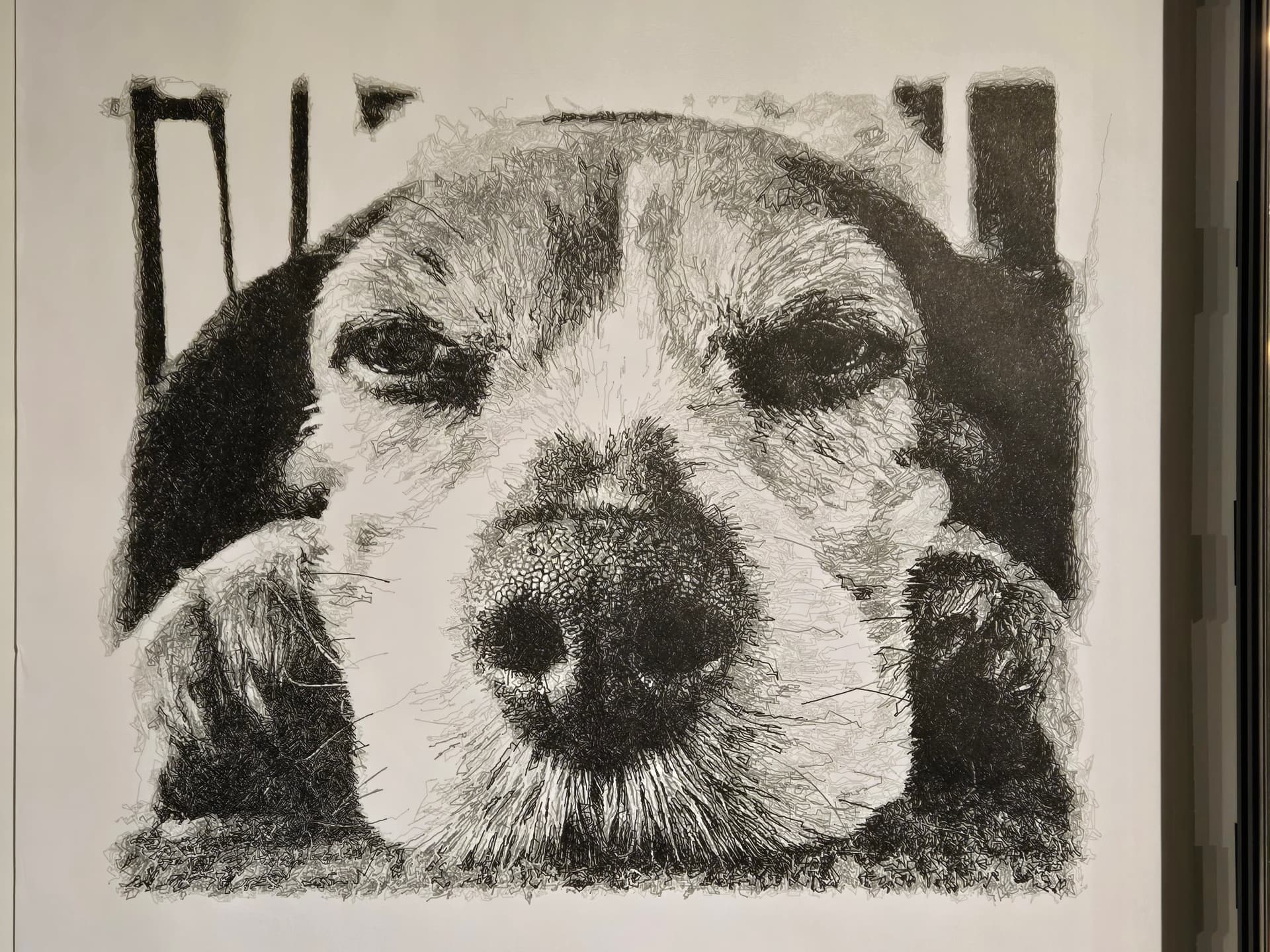 This is my beagle Sadie who passed away a few years ago. I didn’t keep track of how long it took. Maybe 8 - 10 hours? It’s 3 Pigma Micron 08s (0.5mm - what I could find in a pack of grays). About 1500 feet of lines. (Side note - I got a Micron PN to try which has a hard plastic nib. The regular ones start fine but wear down, which is ok. I can adjust settings to deal with the increased width. I might try something finer than an 05 (0.45mm) since once the rounded part of the tip is worn off, it appears to last awhile.)
