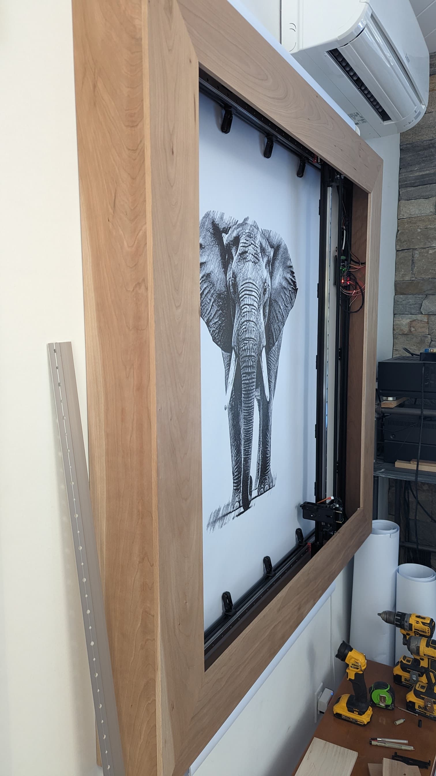The overall size of the frame is 51 1/4" H x 51 1/4" W x 5 5/8" D. All the pieces are 5 1/4" wide (based on a standard 1x6 board width). I planed them all down to 3/8" (10mm) to make it lighter. It would be very heavy using 3/4" boards. If you did leave the boards at 3/4", then obviously the frame size would be 3/4" wider and taller and 3/8" deeper. The frame cleans things up but doesn’t really hide much unless you are standing 6’ away and looking straight at it. I attached some wood blocks to the backboard in the upper corners for the frame to sit on. Then 2 small screws on the top (only visible from above) hold the frame to those blocks. To remove the frame, take out the screws, remove the paper (it slides through slots in the top and bottom of the frame), and disconnect the led lighting power leads from the Jackpot board. The plotter is held on the wall with a French cleat. That creates about 1/4" of space between the wall and the back board, but the frame mounts flush with the wall (see pic), so it hides that space.