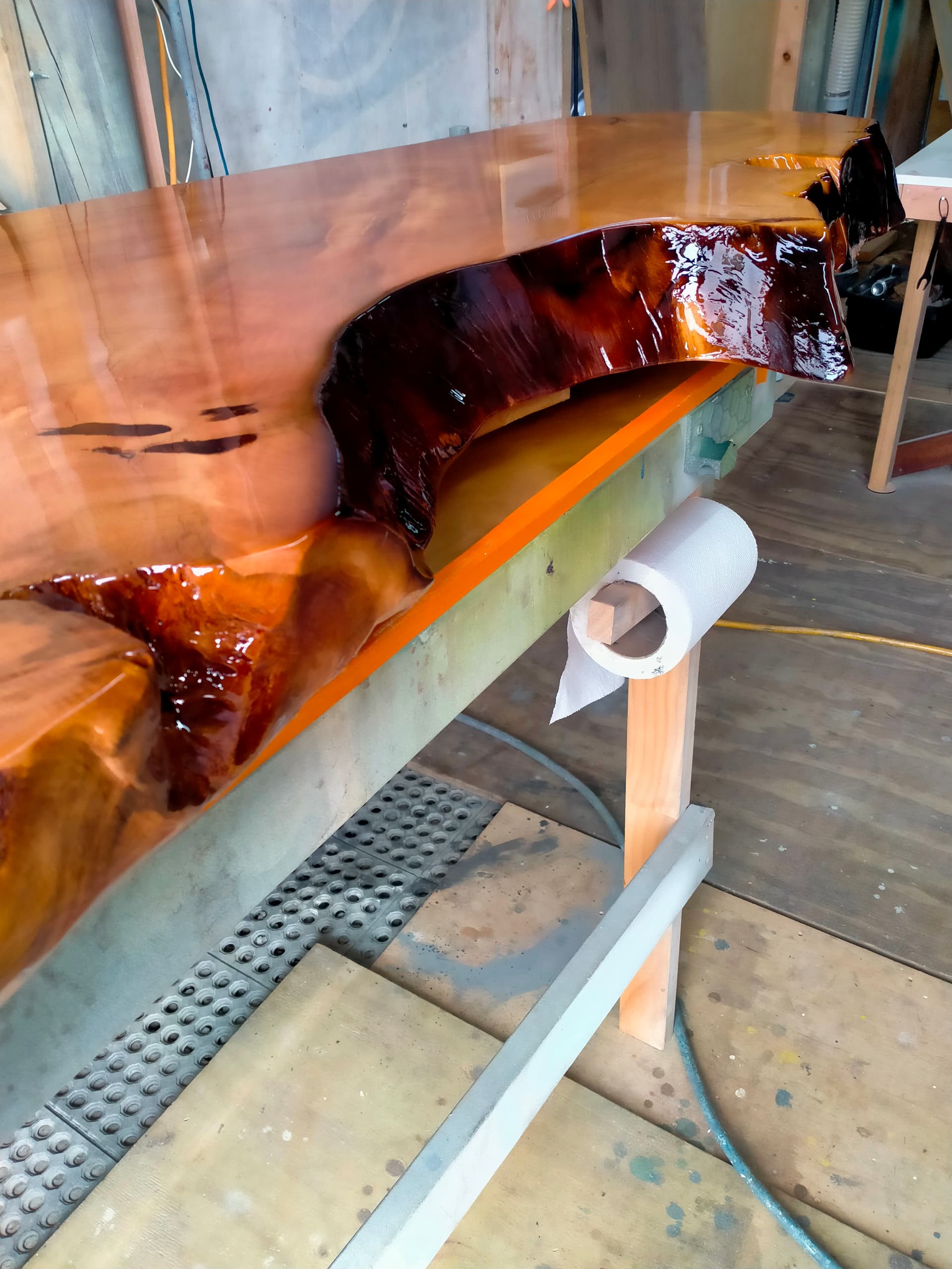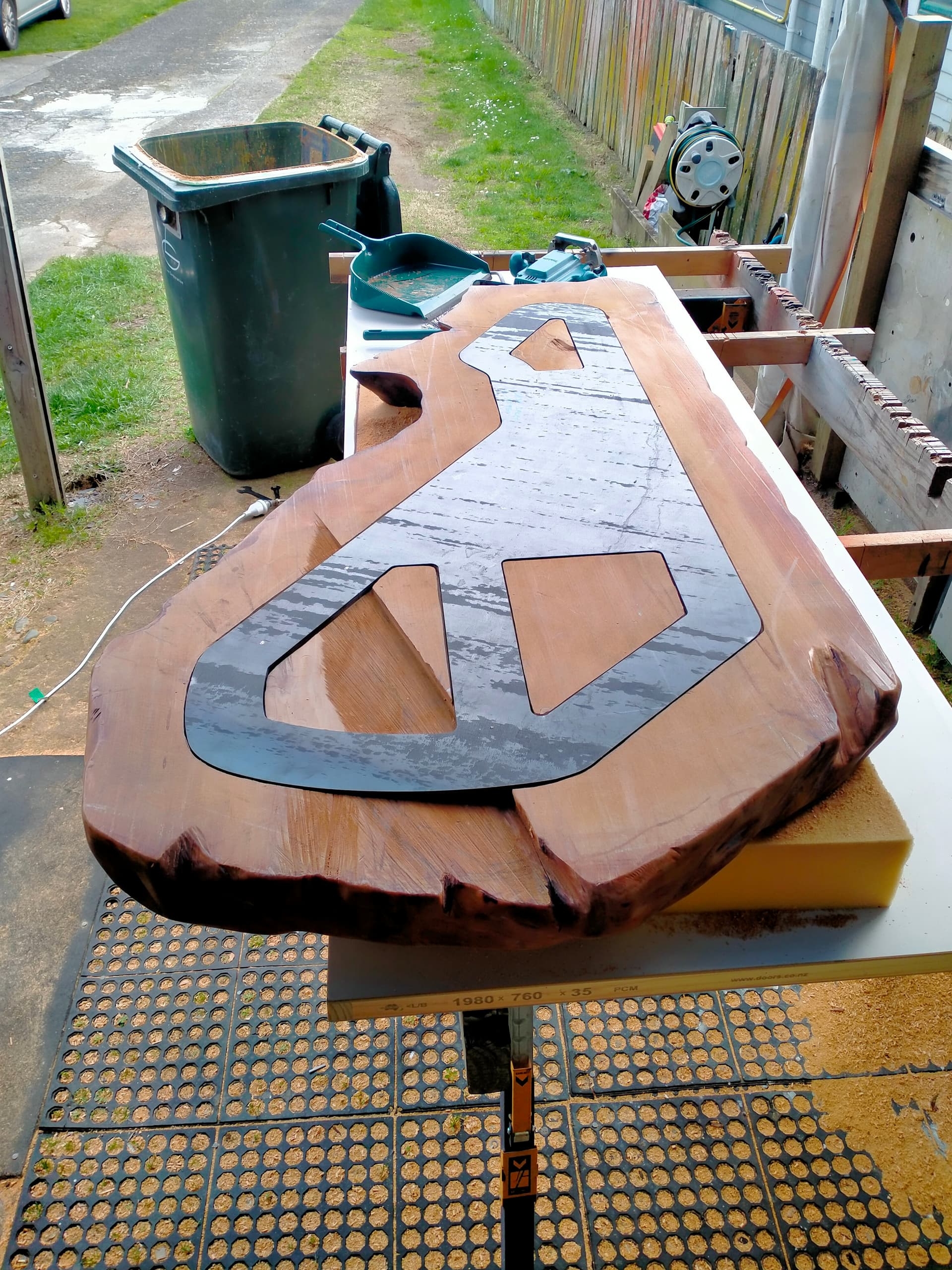 there is 12 coats of 2k high build timber sealer . applied 3 coats at a time than sanded and than finished with 6 coats 2 k clear, ended up having to buff clear due to couple bits of dust , normally don’t polish clear as it highlights grains etc better unpolished