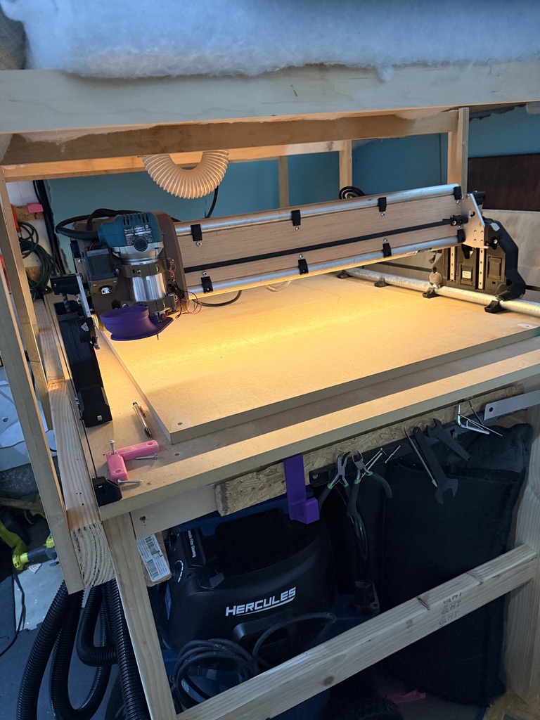 It turns out my table (a rectangle with 3 cross beams, all 2x4’s) wasn’t fully supporting the tabletop, and it being OSB meant that my table was not flat. OSB was all I could afford at the time, but now I have a local place that sold me a 4x10’ 3/4” MDF sheet, and they cut it to my dimensions for $55, so I got a table top, spoil board, elevator plates, and a bunch left over all ready to go
