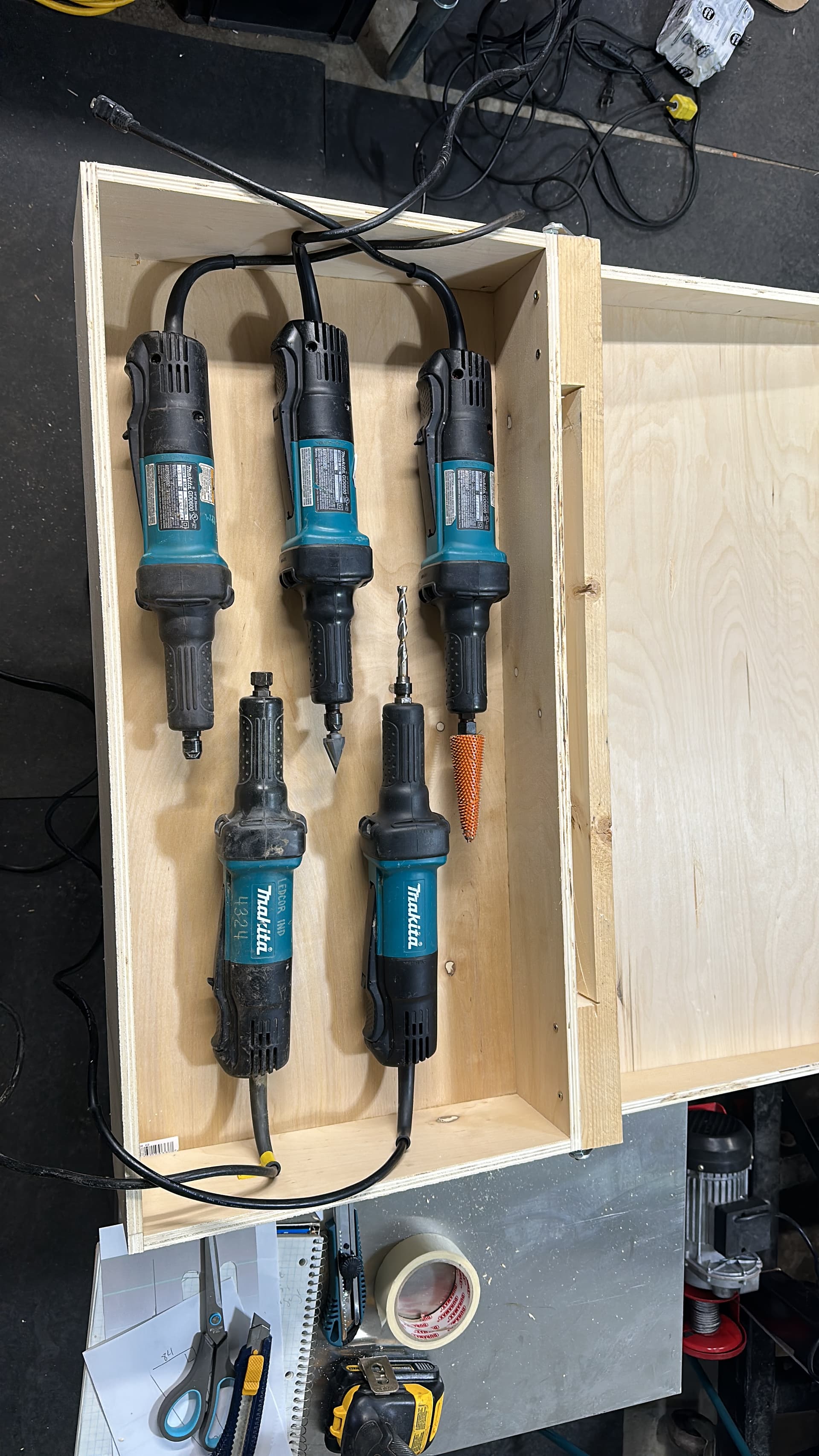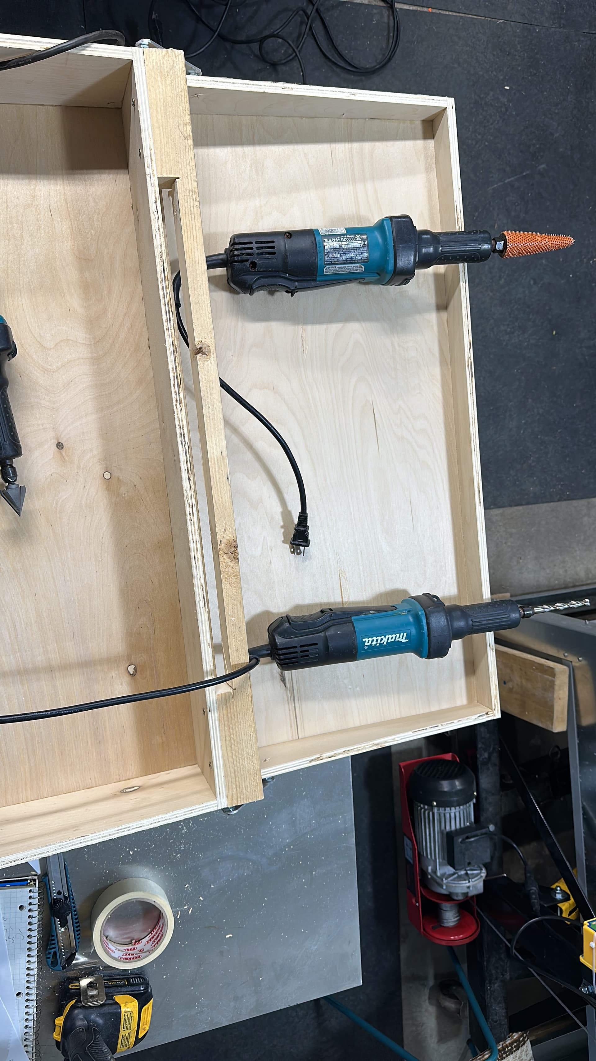 [ As an aside, I’m building these crazy cool flip open tool boxes I stumbled across one night on YouTube. They’ll be used when I’m on site to keep my die grinders and angle grinders (and maybe all my chisels and hand tools) organized but in a very accessible package. The power tool cases will have flip down “hangers” in the top sections to hold tools that are in use and the ones in the lower section should be heavy enough to keep the box when in “cabinet mode” stable on whatever it’s sitting on. ]