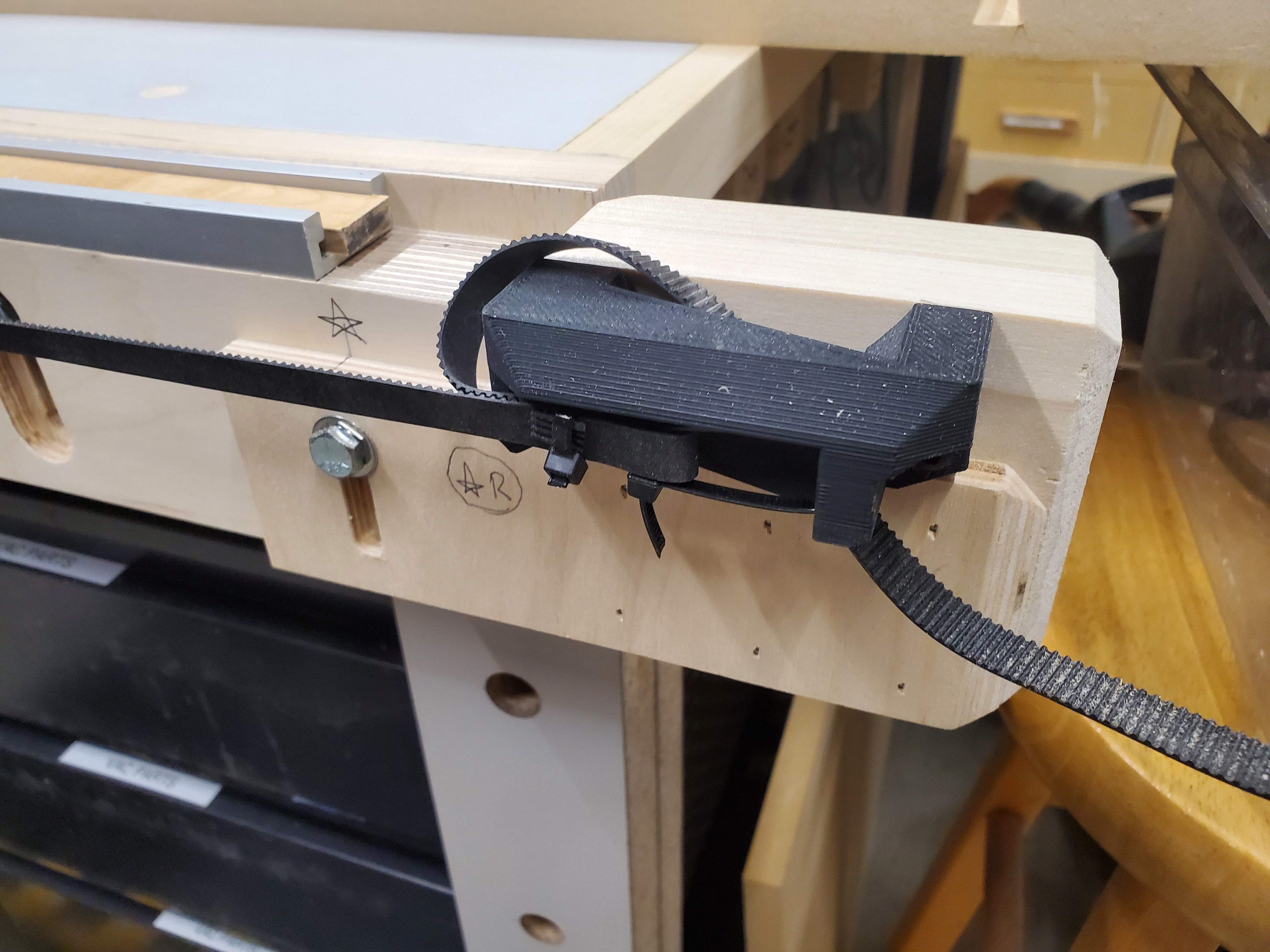 Hereās what I have done to accomplish this. I created a removable block to hold the belt and adjust height of needed (though once it was completed I donāt think height adjustment will be needed) this mounts on the end of rails that also can raise or lower for my multi-purpose bench top where I can mill sheet goods with my circular saw. Thereās a miter track on the top of the rails where the wheels of the y axis sit (too deep at first, but I placed a .25 inch strip in there and itās good) Iāll use that miter for circular saw and router sleds for case work.