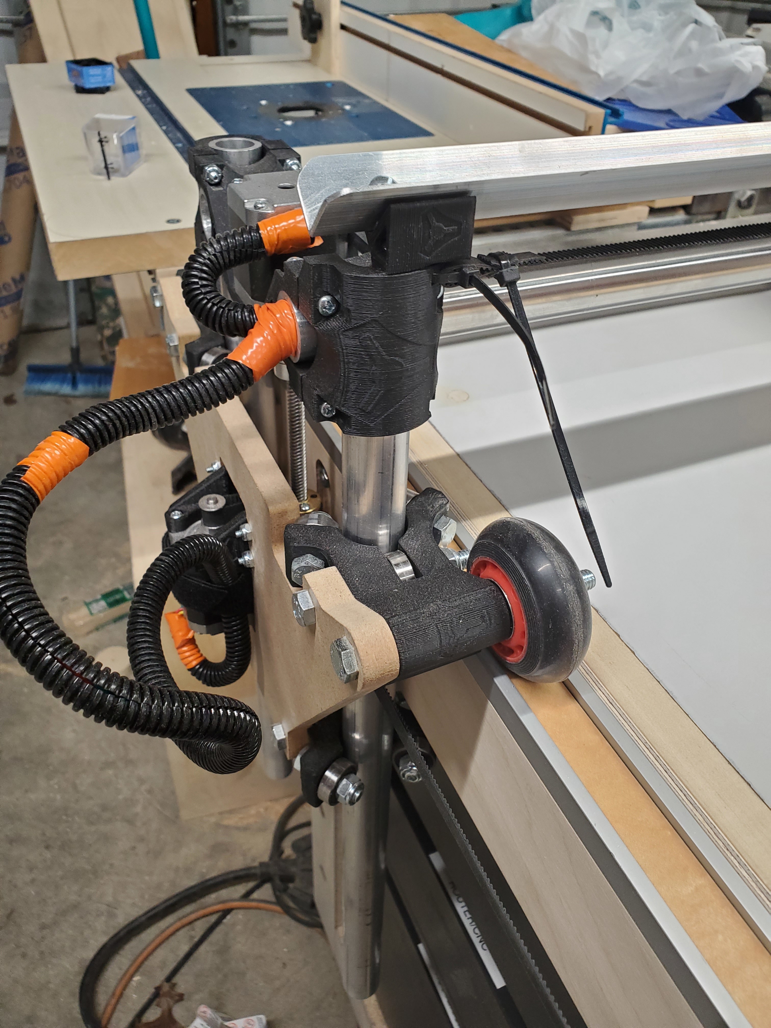 It would be cool if the router were mounted on a vertical surface rather than horizontal so we could take advantage of things like the carbide3d router mounts or what is on the shapeoko. This would allow more control over how much of the router and collet sticks out of the bottom plate without having to be a victim to the design of a router base that comes with the router. Pros and cons to both though.