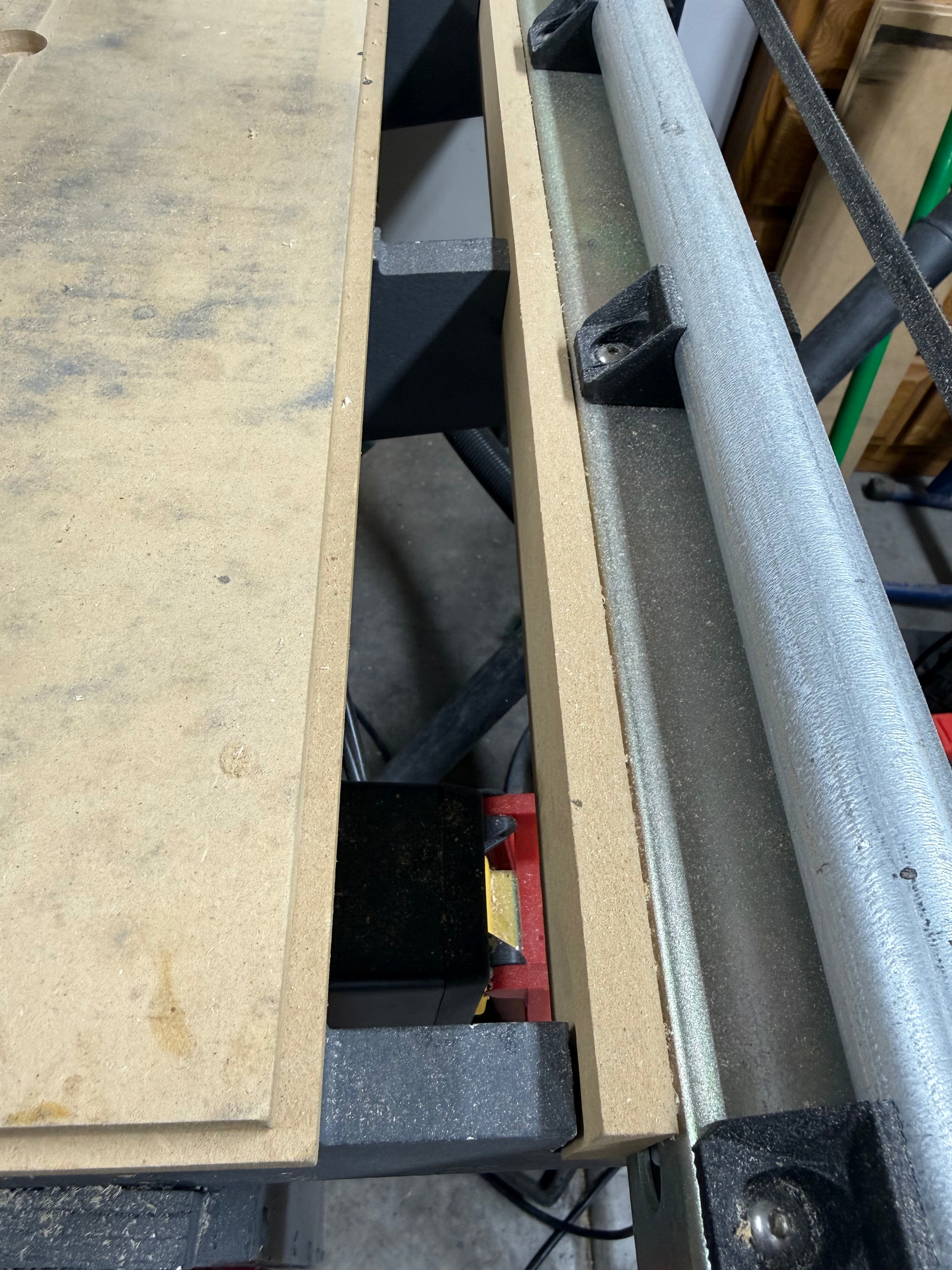 Makes a big mess on the floor but I do think it helps minimize buildup on the riding surfaces. I’ve been meaning to add a brush along the shim piece to further deflect the sawdust.
