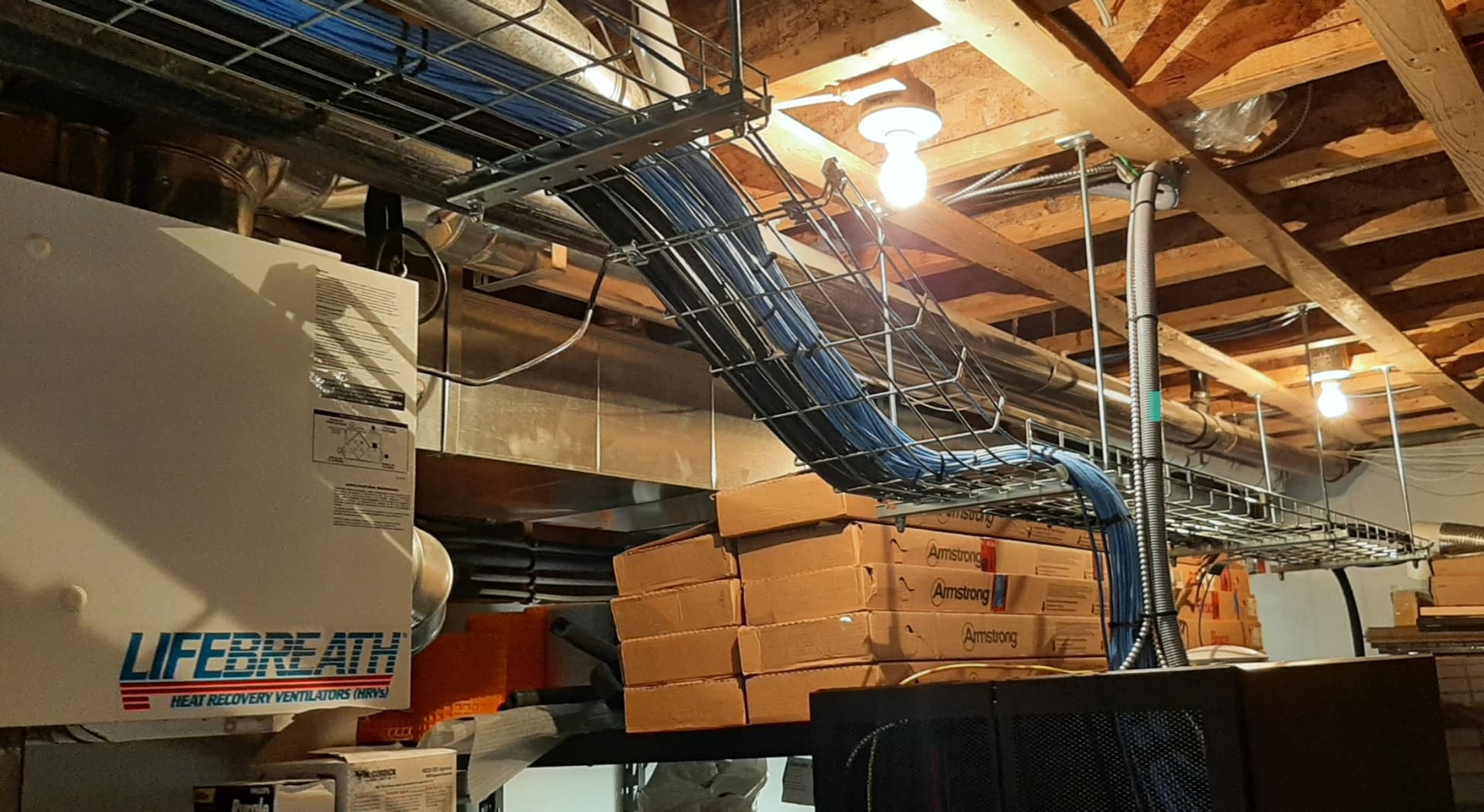 No cable tray. All those wires were like a spider web going every direction. Not a big job but alot of work for me. There were three office’s, Two POS systems opposite ends of the building and the com room was upstairs. The roof inside is 23’ high at the peak so running some of those were sketchy.
